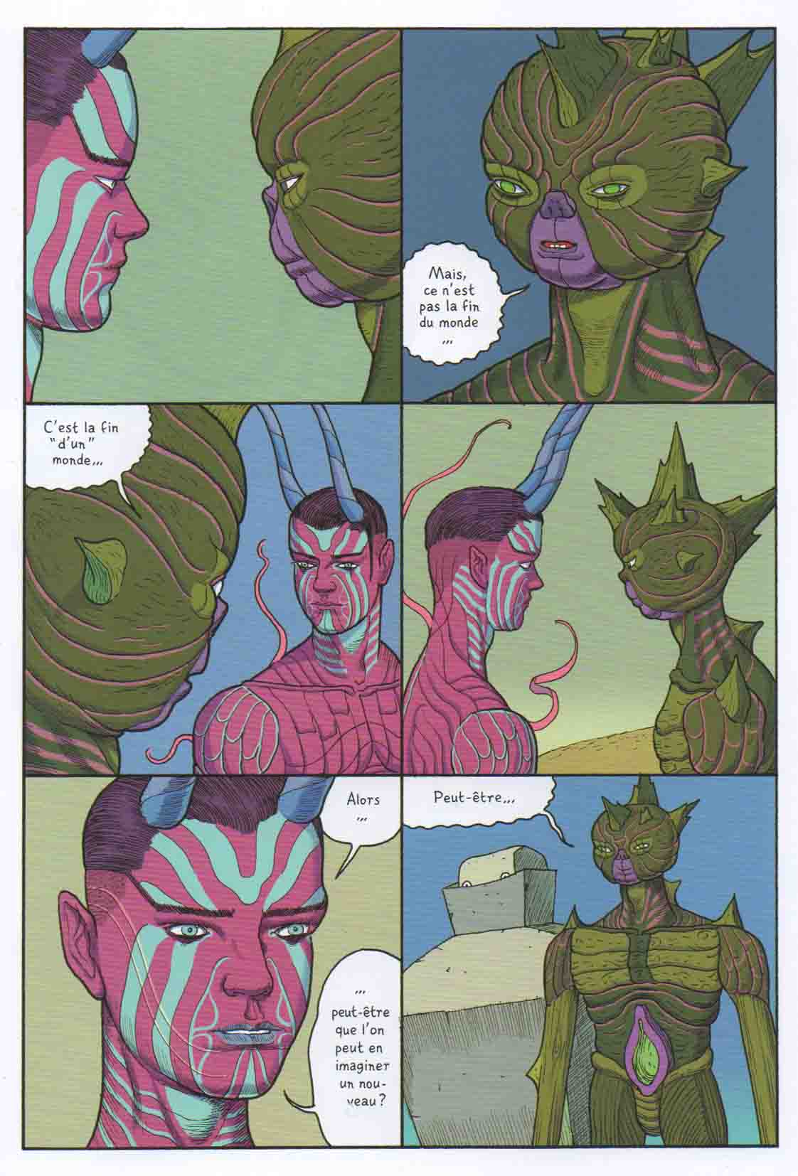 D’abord sur le plan du dessin. C’est un véritable feu d’artifice graphique qui, dès le premier tiers de l’histoire, va se déployer sous nos yeux ébahis. Avec la chute d’une nouvelle météorite, la narration va évoluer de pair avec la structure visuelle. D’abord centrée sur les protagonistes et leurs altercations résultant de l’attentat manqué, sur un rythme échevelé, elle va prendre par intermittence la forme d’une suite de tableaux bibliques spectaculaires, destinées à situer le contexte général. Un contexte perturbé par ladite catastrophe, qui a son tour, telle une répétition de l’Histoire, va générer cette fois des géants, qui comme les Epiphanians, vont sortir de terre. Par un effet de réaction en chaîne, un terrible chaos digne de l’apocalypse entraînera guerres et destructions. Mais la suite réservera bien d’autres surprises au lecteur, qui ne se dévoileront qu’une fois le calme revenu. Impossible d’en dire plus à ce stade, mais certaines planches suscitent autant la sidération que l’émerveillement. Le jeu des couleurs, qui pouvaient apparaître ternes au début de la trilogie, s’est affiné. Sans souci de crédibilité, les tonalités artificielles créent une atmosphère irréelle qui contribue un peu plus à nous transporter dans une dimension onirique, loin de notre Terre à terre…
