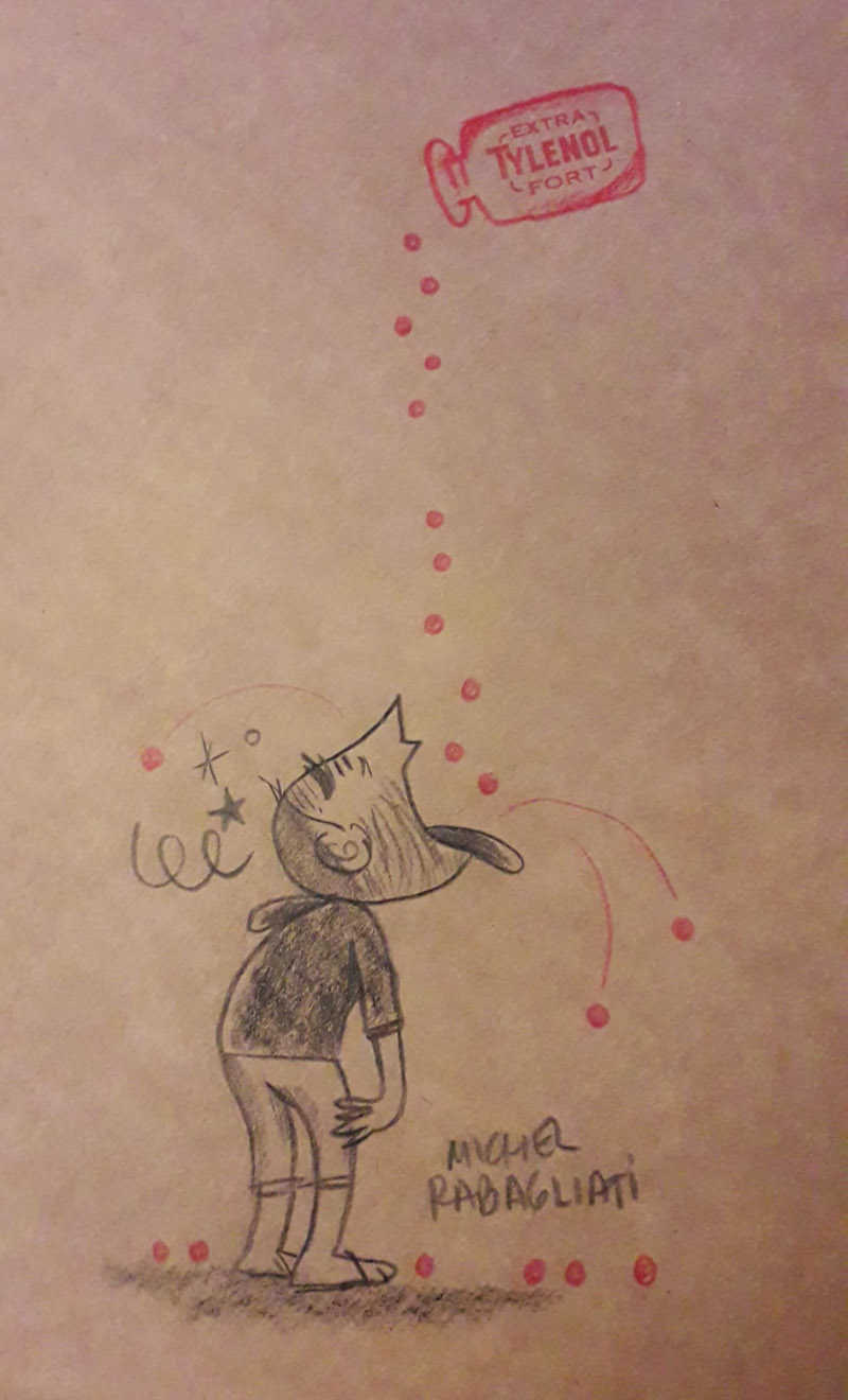 Encore de très belles rencontres cette année, avec notamment Aj Dungo, auteur très attachant de In Waves (Casterman), ainsi qu’Inès Léraud et Pierre Van Hove, les auteurs d’Algues vertes, une enquête édifiante publiée chez Delcourt. Je suis par ailleurs assez dépité d’avoir manqué Michel Rabagliati, l’auteur québécois des aventures de Paul, son double cartoonesque (La Pastèque). Très bêtement, car apparemment, nous étions tous les deux dans la salle de presse de l’Hôtel de ville au même moment. Pour l’attendre, je m’étais même installé sur une table en carton où avait été dessiné un petit crobard très fun par… Rabagliati lui-même, me disant que c’était de bon augure. Eh bien non, ce n’était pas du tout de bon augure, la preuve !! Du coup, j’aurais presque bien embarqué la table en souvenir de ce rendez-vous manqué, mais je ne dois pas être assez fétichiste… Une autre interview fut annulée avec Ludovic Debeurme, qui n’était pas très en forme. Quant à la dernière, avec David B., auteur d’un ouvrage sur André Breton, elle s’est fort logiquement soldée de façon surréaliste, avec la moitié de l’entretien coupée à l’enregistrement… David, recroisé plus tard lors d’une session de dédicace, m’a suggéré d’inventer la partie manquante. Je suis tellement flatté d’inspirer autant la confiance !