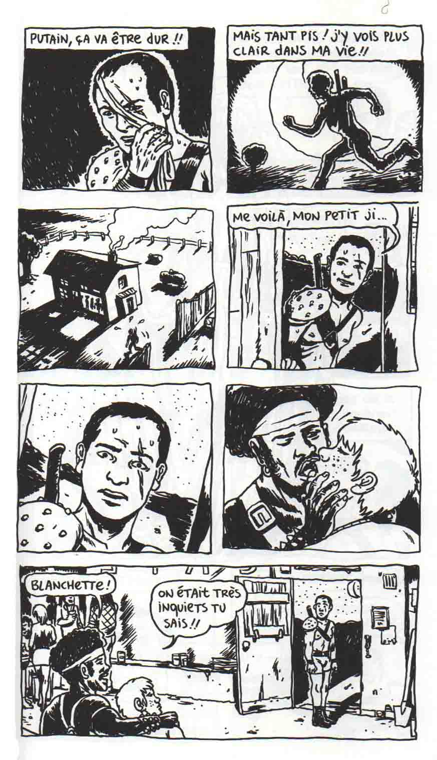 Le dessin, typiquement underground, est paradoxalement pas très sexy et mal fichu au premier abord, dans une présentation basique en gaufrier à huit cases, avec quelques incohérences (pourquoi d’une case à l’autre, un des personnages apparaît nu puis habillé ?) mais qui révèle néanmoins un style, dont le pouvoir de séduction tient beaucoup par son urgence et sa liberté absolue. Un dessin punk à chien qui pue la sueur, le sang et le sperme, un dessin à la machette qui taille dans le vif et qui défriche.