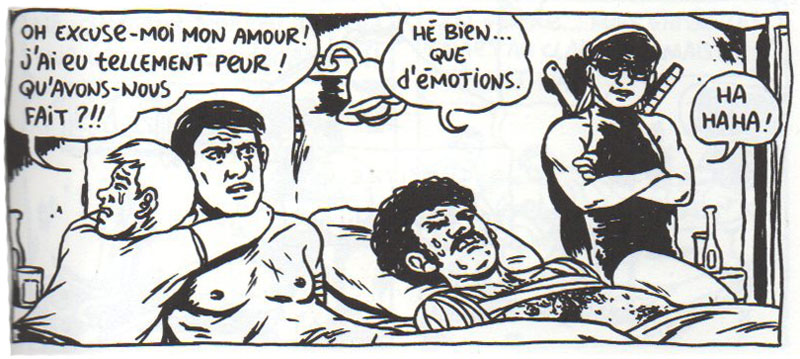 Du reste, Olivier Texier ne revendique rien (d’ailleurs on ne sait même pas s’il est vraiment gay), se fiche d’être présentable autant que classé X, se plaît à représenter la baise homo crade, et là on est plus proche de l’érotisme trash d’un The Hun que de celui à tendance cuir clean d’un Tom of Finland. Dans une Vendée post-apocalyptique où la barbarie règne en maître, les héros suivent leur quête et n’échappent pas aux mauvaises rencontres qui leur font perdre à chaque fois, qui un bras, qui une main, qui un œil… Cela n’amoindrit en rien leur désir sexuel, qui bien au contraire semble décuplé dans ce contexte menaçant et mortifère. De plus, les passions amoureuses entre nos mâles ne sont pas absentes, comme un clin d’œil ironique aux navets « porno chic » à l’eau de rose. Sujet incontournable en Vendée (l’auteur est nantais et donc voisin de cette région très imprégnée de catholicisme), la religion est également évoquée, avec la vision récurrente de la Vierge dont les statues sont régulièrement défigurées par l’ennemi et ses armées de démons. Telle une provocation ultime de Texier, ces héros amoraux, grands « pécheurs » devant l’éternel, la vénèrent et déplorent évidemment la mutilation de leurs icônes, ne faisant que motiver leur détermination à combattre leurs ennemis.