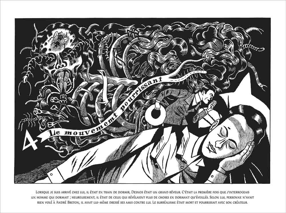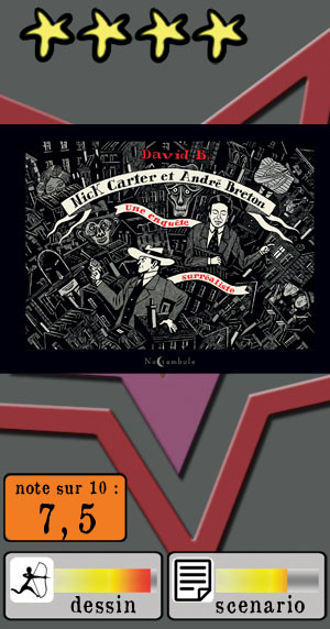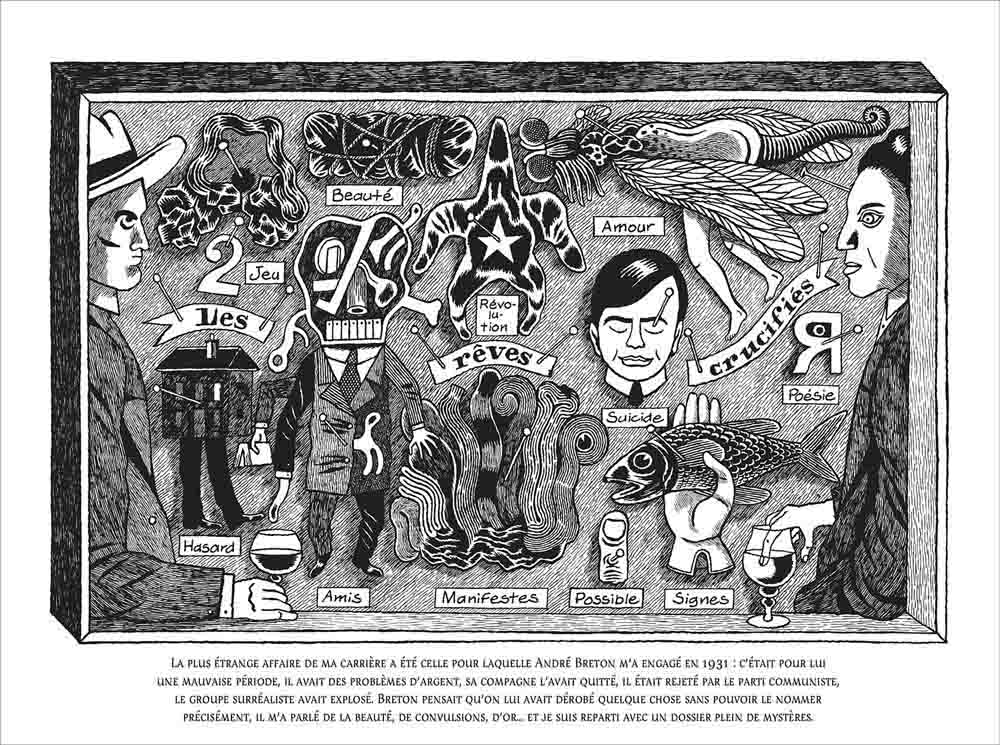 Pour évoquer l’homme, David B. s’est centré sur la seconde partie de sa vie, à partir de 1930. Il a eu en outre cette idée originale de la raconter sous l’angle de la fiction, en faisant référence à une personnage de roman-feuilleton américain de l’époque, le détective Nick Carter, qui vivait toutes sortes d’aventures échevelées, ce qui plaisait beaucoup aux surréalistes.
