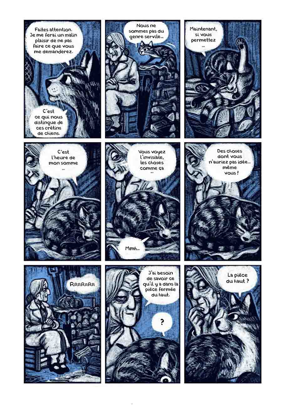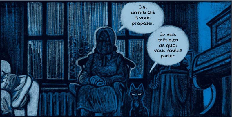 D’emblée, le lecteur est happé par l’étrange atmosphère de ce récit crépusculaire, où la fin du monde est annoncée, avec son lot d’inondations et de pluies diluviennes. La bichromie bleue confère une ambiance nocturne renforçant le mystère d’une narration qui nous fait constamment douter de la réalité des choses. Tout d’abord, il y a ce dialogue entre la jeune femme et sa voix intérieure, qui semble être la voix de la raison l’empêchant de sombrer dans la folie. Toujours pour lui rappeler que sa mère n’est plus de ce monde, et que la tempête en cours et cette histoire de fin du monde ne sont peut-être que le produit de son imagination… Il y a ensuite ce huis clos réunissant les trois protagonistes (la jeune fille, la vieille dame et le chat) dans cette grande bâtisse vide, son propriétaire, père de la jeune fille, ayant dû être hospitalisé à la suite d’un infarctus. Une demeure digne d’un film d’Hitchcock, avec cette vieille dame un peu inquiétante venue y chercher refuge. Lorsque celle-ci entame une conversation avec Capsule, le chat de la maison, l’histoire basculera un peu plus dans une dimension parallèle. Car cette dame — dont l’identité et la fonction nous seront vite révélées — va pousser notre jeune héroïne à franchir la porte de cette « chambre du haut », cette pièce fermée depuis des lustres, dont la clé est perdue, mais qui semble contenir de lourds secrets… C’est un peu à son insu qu’elle comprendra que pour renaître, il est parfois nécessaire de précipiter la fin du monde que l’on connaît, d’une certaine façon de « mourir »…