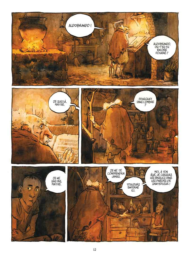 Le résultat est plutôt concluant, malgré des dialogues assez quelconques, compensés par le charme du trait délicat de Critone, qui opère rapidement. Ce dernier sait révéler la grâce ou le ridicule d’un visage, en glissant une dose de caricature quand il s’agit notamment de Brudagone, le roi tyrannique du Royaume des Deux Fontaines. Immédiatement identifiable, le personnage tout fluet d’Aldobrando est très attachant dans sa candeur et sa fragilité. La mise en couleurs de Francesco Daniele et Claudia Palescandolo est très réussie également. On reste contemplatif devant ces superbes aquarelles produisant de chaleureuses atmosphères en clair-obscur.