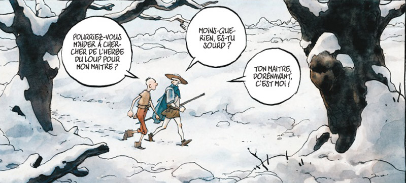 L’histoire est celle d’une quête initiatique assez classique, mais s’avère bien construite avec des retournements imprévus et pourtant sans esbroufe, sans dragons ni magiciens (ouf !) avec des ellipses judicieuses qui nous évitent les habituels combats interminables (la scène finale dans l’arène). Du coup, plutôt que de se plier aux canons habituels de l’heroic fantasy, cette quête au demeurant très sobre préfère puiser dans le roman de chevalerie traditionnel — si l’on exclue le fait qu’il y ait très peu de chevaux, Gipi ayant pris soin de détourner les clichés liés au genre —, s’appuyant sur une morale philosophique se résumant à cette formule : peu importe le trophée, seul compte le chemin emprunté pour le décrocher. De plus, l’amour n’a pas été oublié, avec deux histoires parallèles, celle d’Aldobrando et Beniamino, remettant malicieusement en question une pseudo théorie bêtasse sur les couples assortis.