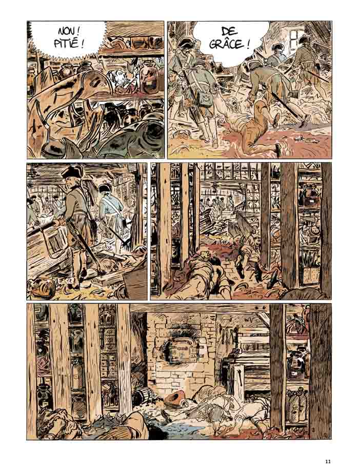 La narration quant à elle, est extrêmement touffue, mais pour le dire plus crument, on risque de s’y perdre, si l’on ne possède pas une connaissance minimum de la période. Bien sûr, on sait gré aux auteurs d’avoir inséré au début de chaque chapitre un résumé du contexte historique, mais cela ne suffit pas toujours à fluidifier la lecture. On aurait aimé avoir plus d’annotations pour aider le lecteur à appréhender les diverses circonvolutions scénaristiques. Certes, l’originalité de la démarche réside incontestablement dans le fait d’avoir mis en scène, en plus des personnages historiques, des gens du peuple, des anonymes, des « crève-la-faim », mais les protagonistes sont nombreux, et on parfois du mal à les identifier, la représentation des visages n’étant pas le point fort du dessin. Très souvent, les regards semblent se perdre dans le vide, ce qui peut apparaître gênant lors des dialogues, déjà surabondants, et donne un côté lunaire à certaines scènes.