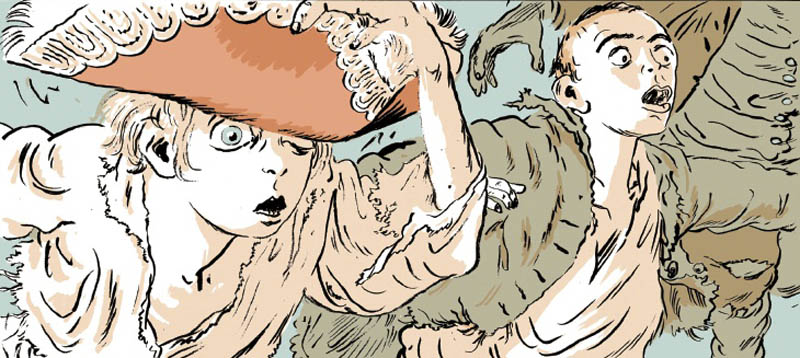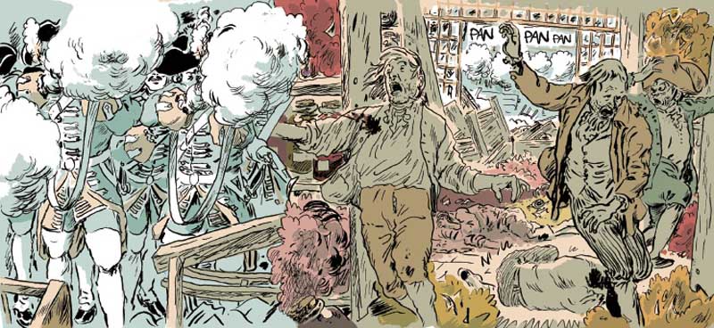 Tout d’abord, on ne pourra faire autrement que de saluer le travail admirable des auteurs, quasi inconnus avant leur révélation par ce Fauve d’or. Florent Grouazel et Younn Locard ont mêlé ici leurs talents dans une production commune, tant par le scénario que par le dessin, parce que oui, tous deux savent manier le pinceau comme le stylo. Graphiquement, leur style est si proche qu’on a du mal à voir qui a dessiné quoi. Et finalement, c’est ce qui compte pour la cohésion d’un récit, mais qui en dit long sur leur relation visiblement très fusionnelle. Même si l’on ne trouve aucune bibliographie en fin d’ouvrage, on est obligé d’en déduire que les auteurs ont dû passer un temps non négligeable à rassembler documentation historique et iconographie d’époque. On ne peut être qu’impressionné par le sens du détail dont ils font preuve, tant dans l’architecture que dans les tenues vestimentaires. Très spectaculaires, les planches pleines page (la prise de la Bastille, l’assemblée constituante à Versailles, le peuple en révolte dans les rues de la capitale…) nous immergent littéralement dans cette ambiance révolutionnaire, et pour un peu, la bande dessinée aurait l’air d’époque dans sa tournure baroque.