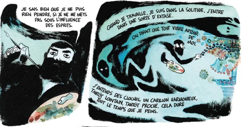 Dans cette entreprise de réhabilitation de ces célébrités longtemps dédaignées par l’art officiel, Anne-Caroline Pandolfo est comme toujours admirablement relayée par son compère Terkel Risbjerg, qui expose ici toute l’étendue de son art, encore plus que d’habitude. Son trait époustouflant se déploie sur des planches entières comme sur la toile d’un peintre, explosant les cases dans une sorte de tourbillon où liberté et folie se mêlent dans une communion totale. Une démarche qui ne fait que corroborer les propos de Michel Thévoz, relayés plus haut, selon lesquels art brut et bande dessinée font décidément bon ménage.