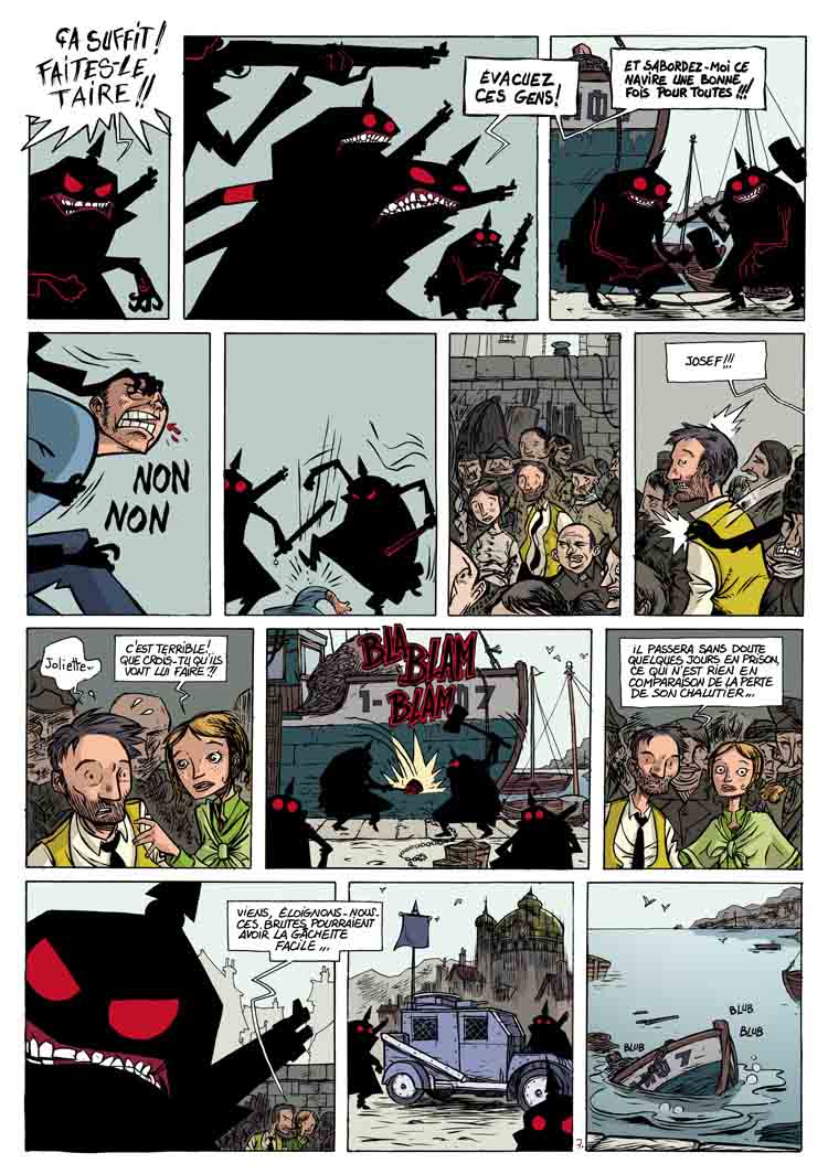 L’ambiance est souvent très sombre et pourtant jamais glauque. Le dessinateur Alfred a un sacré coup de patte qu’il gère sans coup férir. Toujours intéressantes à détailler, les cases comportent de nombreuses références à la peinture moderne du début du XXe siècle, deux des protagonistes étant d’ailleurs peintres eux-mêmes. Son trait, anguleux et tendu comme un arc, s’inspire d’un néo-expressionnisme à la fois nerveux et menaçant, se voyant renforcé par une composition audacieuse. A souligner une certaine évolution au fil des tomes, inconsciente ou non : perdant en précision, le crayon semble s’adapter, plus naïf, plus abstrait, plus onirique alors que l’histoire s’accélère et que l’abattement semble gagner du terrain. Les couleurs sont superbes, passant avec bonheur des tons chauds bouillants à des nuances obscures et glaciales. Il n’y a quasiment rien à reprocher du point de vue visuel, c’est très original, efficace et stylé, et reflète bien l’atmosphère lourde de menaces de l’entre-deux-guerres sur le vieux continent, ici en l’occurrence dans un pays (imaginaire) qui pourrait être l’URSS.