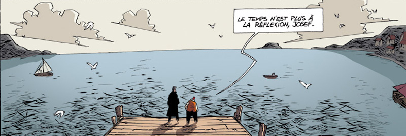 L’ambiance est souvent très sombre et pourtant jamais glauque. Le dessinateur Alfred a un sacré coup de patte qu’il gère sans coup férir. Toujours intéressantes à détailler, les cases comportent de nombreuses références à la peinture moderne du début du XXe siècle, deux des protagonistes étant d’ailleurs peintres eux-mêmes. Son trait, anguleux et tendu comme un arc, s’inspire d’un néo-expressionnisme à la fois nerveux et menaçant, se voyant renforcé par une composition audacieuse. A souligner une certaine évolution au fil des tomes, inconsciente ou non : perdant en précision, le crayon semble s’adapter, plus naïf, plus abstrait, plus onirique alors que l’histoire s’accélère et que l’abattement semble gagner du terrain. Les couleurs sont superbes, passant avec bonheur des tons chauds bouillants à des nuances obscures et glaciales. Il n’y a quasiment rien à reprocher du point de vue visuel, c’est très original, efficace et stylé, et reflète bien l’atmosphère lourde de menaces de l’entre-deux-guerres sur le vieux continent, ici en l’occurrence dans un pays (imaginaire) qui pourrait être l’URSS.