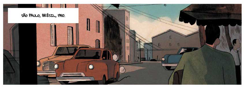 Avec sa très belle couverture aux accents Art déco, l’ouvrage attire. Et lorsqu’on commence à feuilleter les premières pages, on découvre avec contentement le graphisme délicat et épuré du brésilien Anthony Mazza, vaguement rétro, aux tonalités à la fois chaudes et sombres, bien en phase avec cette histoire simple. Celle-ci, scénarisée par l’auteur italien Andrea Campanella, nous emmène dans le Brésil des années 50, avec quelques flashbacks dans l’Italie de la Deuxième Guerre. Davantage porté sur l’esthétisme d’ensemble, qui peut parfois rappeler les splendides publicités de Cassandre, le trait semble un peu moins assuré, voire un peu froid, dans la représentation des personnages qui parfois semblent quelque peu figés, mais l’ensemble reste agréable à regarder.