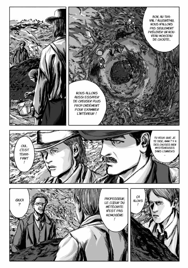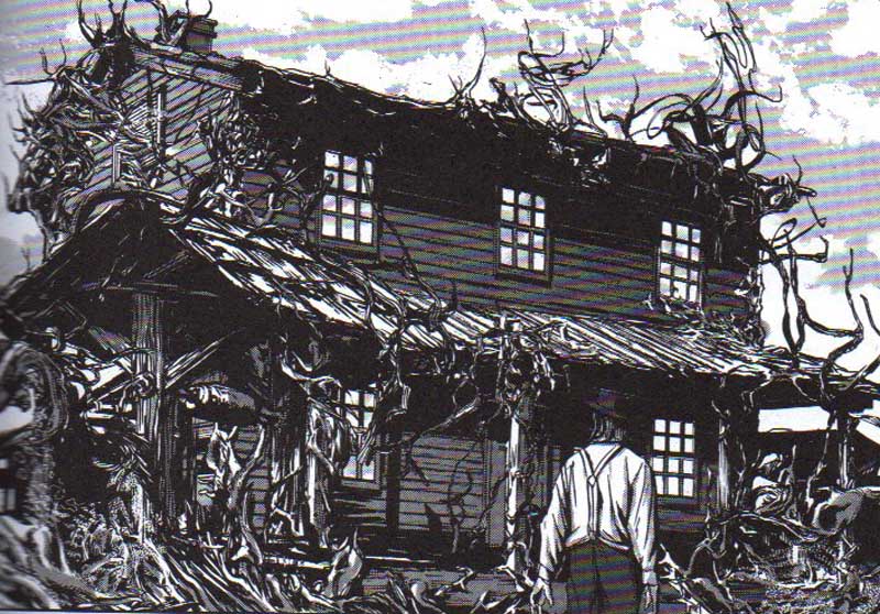 Graphiquement, c’est du grand art. Le dessin sombre et réaliste, en noir et blanc, s’accorde parfaitement bien au scénario, axé principalement sur la descente aux enfers des Gardner, une famille de paysans qui vivait tranquillement jusqu’à ce qu’une météorite s’abatte près de leur maison. Gou Tanabe semblerait presque avoir fusionné spirituellement avec Lovecraft, tant la dimension intemporelle de la bande dessinée est frappante. Non dénué d’un certain académisme, le trait est assuré et d’une grande finesse, se déployant avec talent dans plusieurs scènes spectaculaires. Tanabe sait très bien exprimer l’horreur propre aux romans de Lovecraft, suscitant ce sentiment chez le lecteur par un cadrage serré des regards apeurés sous des ombres menaçantes.