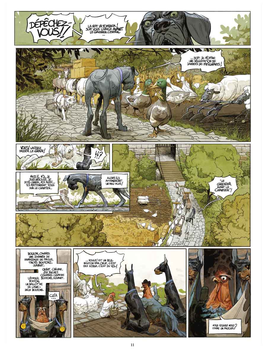Avec ce premier volet, c’est une véritable fable politique — accessoirement animalière — qui se dessine, dans l’esprit de Jean de la Fontaine, à laquelle la formule de ce dernier correspond on ne peut mieux : « Selon que vous serez puissants ou misérables, les jugements de cour vous rendent blanc ou noir ». Et déjà à son époque, le fabuliste avait bien compris la puissance de l’humour contre le tyrannie… Prévu en quatre tomes, Le Château des animaux s’avère une série plutôt prometteuse qui pourrait faire date.