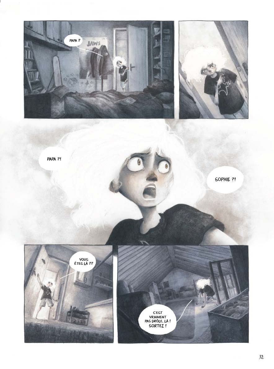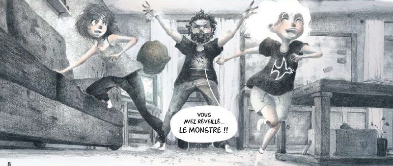 Timothée Leman, jeune auteur qui signe ici sa première bande dessinée après avoir illustré en 2017 un roman jeunesse de Marie-Catherine Daniel, Les Aériens, également chez Sarbacane, révèle ici un talent graphique remarquable et un certain sens de la narration. Si la technique du fusain est plus répandue dans le domaine de l’illustration, cela ne l’a pas dissuadé d’y recourir, et on peut dire que le résultat est bluffant. Chaque case est un régal, sans parler des fabuleuses pleines pages… Cela confère aux décors, représentés de façon réaliste, une patine évoquant le monde de l’enfance et permet d’adoucir l’aspect anxiogène du sujet. L’univers très personnel développé par Timothée Leman n’est pas sans rappeler celui du maître Miyazaki, notamment dans cette approche du merveilleux qui laisse une large place au mystère et aux terreurs enfantines, et reste par ailleurs en phase avec les problématiques écologiques actuelles.