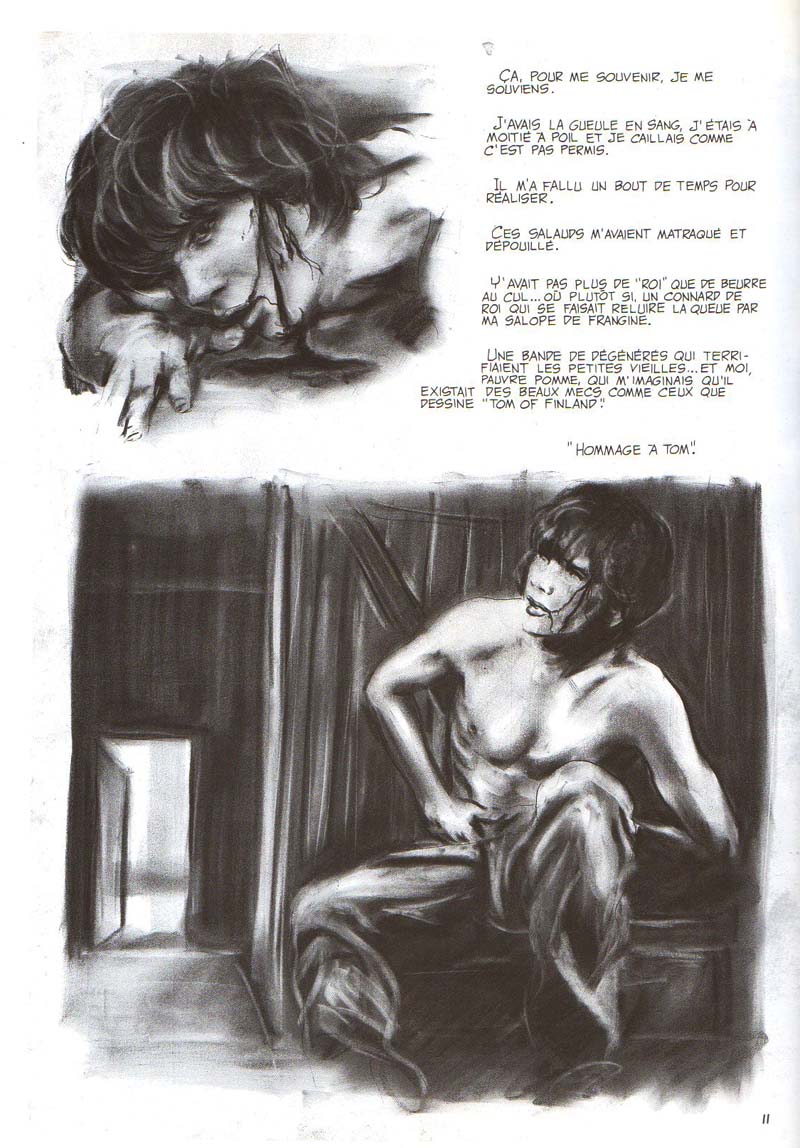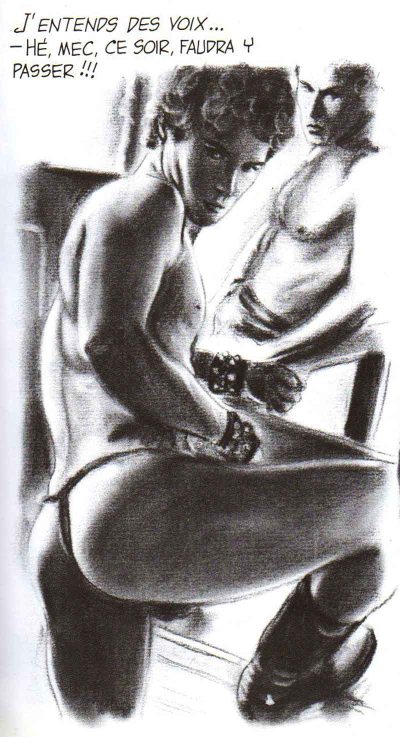 Cette (vieille) bande dessinée, que l’on ne trouve plus qu’en occasion et qui semble faire référence dans le genre homo-érotique, nous donne à observer des actes homosexuels (souvent crades) dépeints paradoxalement avec une belle sensualité artistique. Cinq nouvelles à la tonalité littéraire, où le trash des situations est adouci par les clairs-obscurs, jamais représentées en plein jour, toujours dans des endroits cachés (usine désaffectée, chiottes de commissariat, bouges de truands…). L’ouvrage ne serait-il pas juste un fantasme d’homo pas encore sorti du placard voire d’hétérosexuel par l’odeur (de mâle) secrètement alléché ?