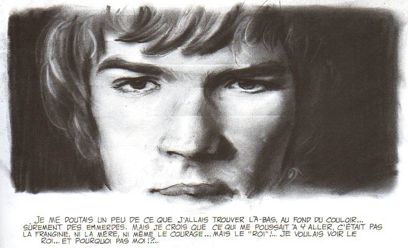 Venons-en au contenu. Si l’on fait abstraction du format maigrelet (46 pages) et l’odeur de vieux grenier (il semblerait qu’Odeur de mâles n’ait jamais été réédité et que l’éditeur n’existe plus), la première impression est tout de même celle d’un objet vieillot, avec une mise en page pas très équilibrée et un lettrage anarchique, un brin daté (en particulier dans la première partie). Si le dessin, réaliste, comporte des qualités indéniables — ici, le fusain est très approprié pour représenter un érotisme à la fois raffiné et torride, cerné par des ambiances en clair-obscur — le découpage reste assez statique, et on est presque davantage dans l’illustration que dans la bande dessinée. On peut regretter le style parfois inégal d’une histoire à l’autre. Pour le reste, malgré la tournure littéraire des textes, on reste un peu sur sa faim à la lecture de ces nouvelles trop courtes qui laissent un goût d’inachevé, et dont aucune ne raconte la « love story » entre Jésus et Satan promise par la couverture…