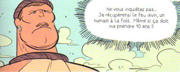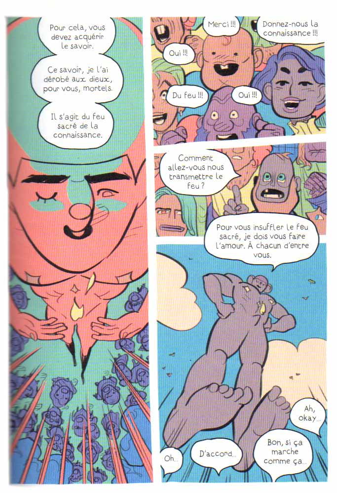Le Privilège des dieux commence avec Prométhée, un titan — l’auteur semble avoir décidément une passion pour les géants, qui tiennent déjà une place centrale dans « Poussière ». Et comme dans la série, ces géants ne veulent que du bien aux humains. Selon le mythe, Prométhée déroba le feu sacré de l’Olympe pour en faire don aux humains et le paya chèrement par la suite, sauf qu’ici, Prométhée fait don de sa personne au sens propre du terme, et le feu en question n’est rien d’autre que sa précieuse semence. Ce qui donnera lieu, on peut s’en douter, à quelques scènes pittoresques, d’autant que le titan n’attend pas le consentement de ses victimes, mais s’il y bien des actes de viol, le traitement humoristique permet d’éluder toute idée de violence ou de souffrance. Un exercice délicat que l’auteur gère parfaitement. Ainsi, le supplice de Prométhée sera beaucoup moins pénible — Geoffroy Monde ne fait pas dans le gore et on lui en sait gré — mais ce personnage va dès lors vite être éclipsé au profit de Mercure, qui se verra confier par les dieux la mission de récupérer ce « cadeau » accordé à toute l’humanité par Prométhée. Le même processus mais à l’envers. Curieusement, Mercure est un dieu romain et on se demande un peu ce qu’il fout sur l’Olympe, mais l’auteur n’est pas à un anachronisme près, d’autant qu’on l’a bien compris, tout est permis ici, on est clairement dans le décalage et l’absurde ! D’ailleurs, il ne faudra pas chercher à tout comprendre. Si l’on y voit pas mal de références, certaines ne feront sens que pour l’auteur, si tant est qu’il y en ait un.