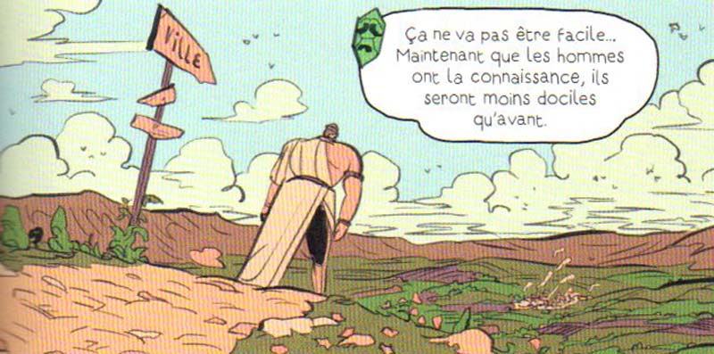 Le Privilège des dieux commence avec Prométhée, un titan — l’auteur semble avoir décidément une passion pour les géants, qui tiennent déjà une place centrale dans « Poussière ». Et comme dans la série, ces géants ne veulent que du bien aux humains. Selon le mythe, Prométhée déroba le feu sacré de l’Olympe pour en faire don aux humains et le paya chèrement par la suite, sauf qu’ici, Prométhée fait don de sa personne au sens propre du terme, et le feu en question n’est rien d’autre que sa précieuse semence. Ce qui donnera lieu, on peut s’en douter, à quelques scènes pittoresques, d’autant que le titan n’attend pas le consentement de ses victimes, mais s’il y bien des actes de viol, le traitement humoristique permet d’éluder toute idée de violence ou de souffrance. Un exercice délicat que l’auteur gère parfaitement. Ainsi, le supplice de Prométhée sera beaucoup moins pénible — Geoffroy Monde ne fait pas dans le gore et on lui en sait gré — mais ce personnage va dès lors vite être éclipsé au profit de Mercure, qui se verra confier par les dieux la mission de récupérer ce « cadeau » accordé à toute l’humanité par Prométhée. Le même processus mais à l’envers. Curieusement, Mercure est un dieu romain et on se demande un peu ce qu’il fout sur l’Olympe, mais l’auteur n’est pas à un anachronisme près, d’autant qu’on l’a bien compris, tout est permis ici, on est clairement dans le décalage et l’absurde ! D’ailleurs, il ne faudra pas chercher à tout comprendre. Si l’on y voit pas mal de références, certaines ne feront sens que pour l’auteur, si tant est qu’il y en ait un.