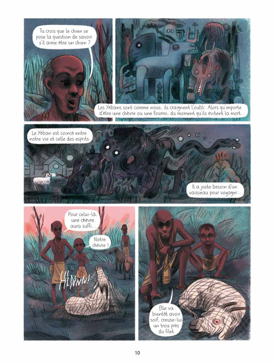 Si l’album est déjà en lice pour le prix jeunesse (12-16 ans) d’Angoulême, on ne peut s’empêcher d’être un brin perplexe. Est-ce juste parce que l’histoire met en scène un jeune enfant ? Pourtant, ce conte, par sa complexité et sa portée philosophique, peut parfaitement viser le public adulte et n’est en outre pas si facile d’accès. Le prolifique Aurélien Ducoudray a ainsi puisé dans un mythe dogon pour raconter l’histoire du jeune Kana, dont le frère jumeau Kubé, né juste avant lui, aura l’honneur d’accompagner son père pour nourrir les hyènes, dont le rire strident empêche les morts de se reposer. C’est ainsi que par un pacte commun, Kana va devoir guider un yéban, être surnaturel métamorphosé en hyène géante, vers un objectif inconnu qui ressemble étrangement aux enfers…