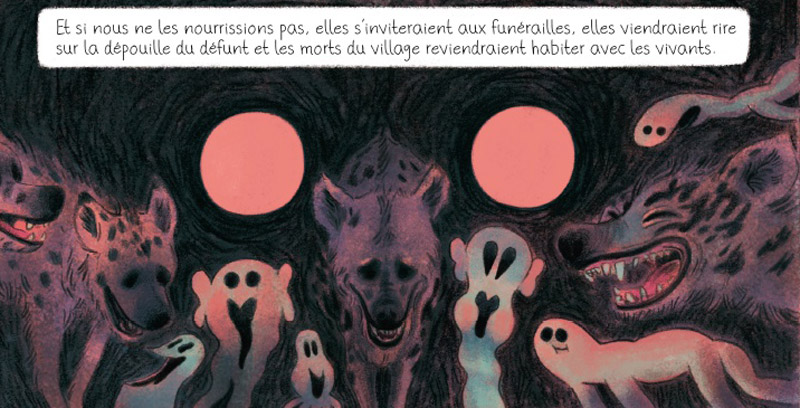 Cet album, qui voit collaborer pour la deuxième fois Aurélien Ducoudray et Mélanie Allag (dont c’est la deuxième bande dessinée), nous emmène cette fois dans l’Afrique des contes et des esprits. Les auteurs nous avaient subjugués il y a quatre ans avec L’Anniversaire de Kim Jong-il, une plongée dans ce pays effrayant et coupé du monde qu’est la Corée du nord, à travers le témoignage d’un enfant de huit ans. Dans Le Repas des hyènes, c’est une fois encore un enfant qui est mis en scène à travers un parcours initiatique empreint d’onirisme.