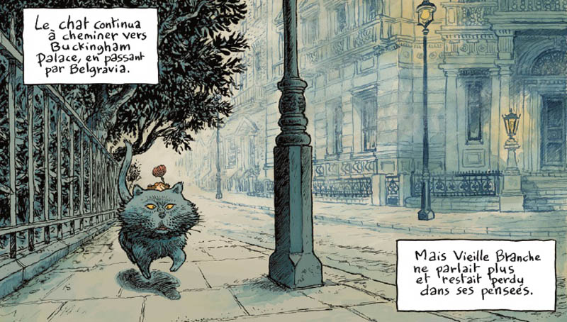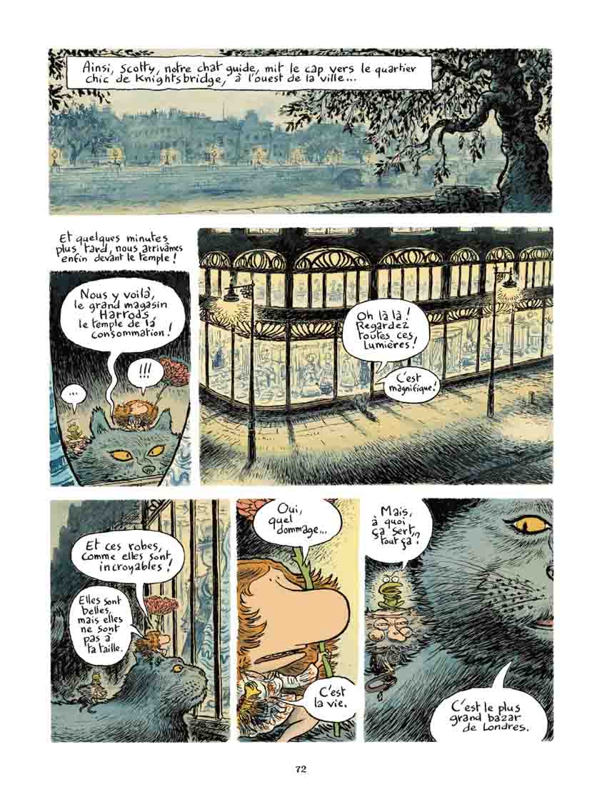 Phicil excelle littéralement avec ce conte aux charmes multiples, comme s’il était parvenu à trouver la combinaison idéale entre écriture et dessin. Tous deux s’allient pour produire une petite merveille bédéphilique, à tel point qu’on imagine mal pouvoir les dissocier l’un de l’autre. La fluidité de la narration propre au genre répond à l’authenticité d’un trait délicieux et unique dont on aperçoit les coutures, idéal pour représenter ces petits êtres aussi difformes qu’attachants, à commencer par Rameau et son physique impossible mais désopilant (une tête énorme, un nez surdimensionné surmonté de petits yeux et une bouche très large), assorti d’une forte personnalité. S’inscrivant dans une tradition littéraire victorienne oscillant entre Gaslamp et low fantasy, Le Grand Voyage de Rameau établit une sorte de pont entre un univers enfantin champêtre et enchanteur et un monde littéraire témoignant d’une période assez noire typique de l’Angleterre industrielle de la fin du XIXe siècle. Jouant sur ces contrastes, le récit va débuter dans une atmosphère idyllique de candeur verdoyante, évoluant progressivement vers l’immensité urbaine et tentaculaire de la « Ville Monstre », d’abord avec l’architecture imposante de Londres et ses salons « cosy », où l’on croisera notamment Oscar Wilde jeune (avec déjà une pointe d’inquiétude quant au contexte social dur et puritain), puis vers les bas-fonds sordides où l’ombre de Jack l’Eventreur est omniprésente. Mais au beau milieu de cette obscurité va scintiller la discrète lumière de nos farfadets par le biais de pierres magiques (les cornalines), qui guideront nos voyageurs vers plusieurs personnages-clés, notamment la Reine Victoria, telles des balises jalonnant le parcours initiatique de la jeune Rameau…