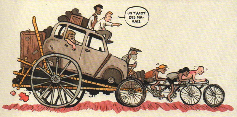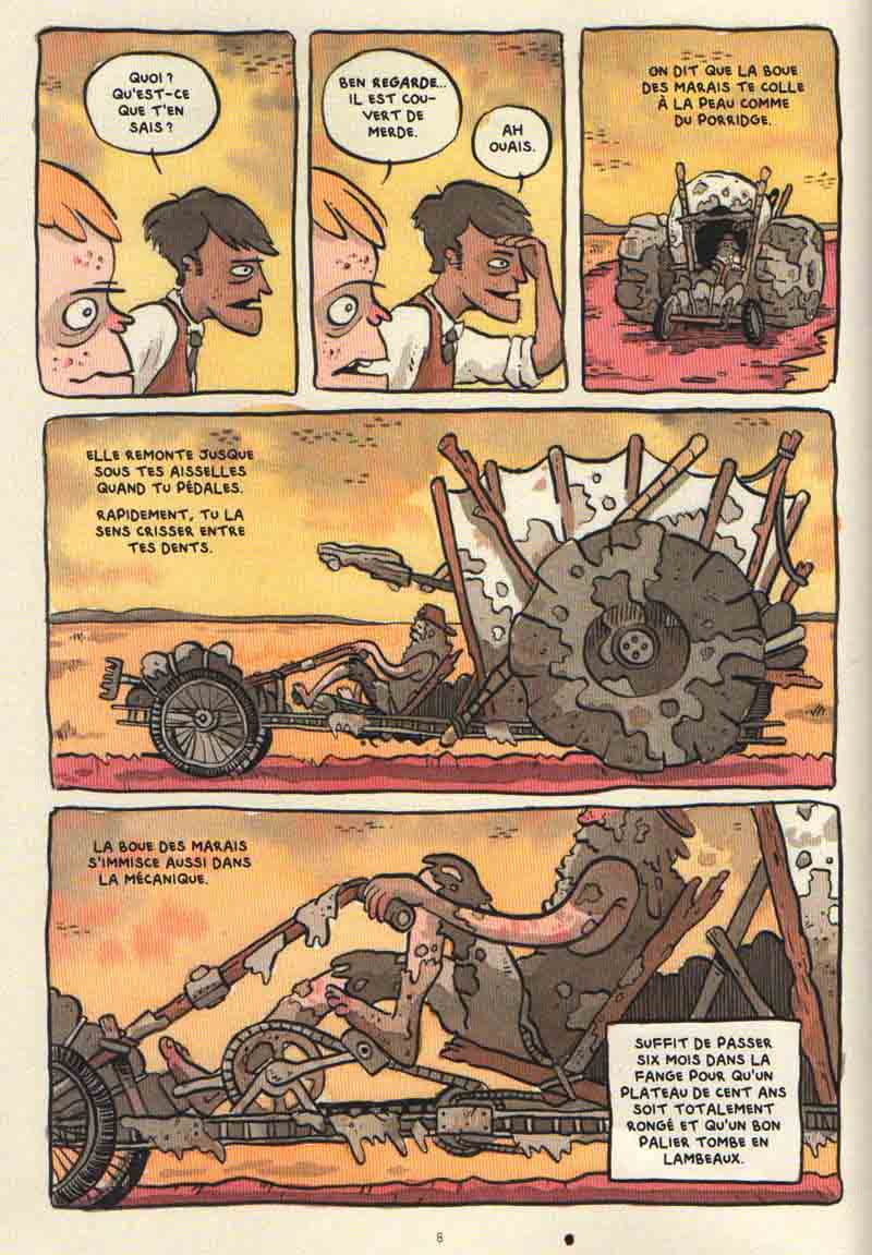 Et bientôt il retraverse les marais. Direction le sud. Il pédale sur le même vieux tacot qu’il a depuis des années. Un vrai tas de merde. Il ressemble à tous les autres losers qui quittent Falter, sauf que le vieux manchot, il pédale un peu plus lentement que les autres ; Mais c’est pas à cause de l’arthrite. Ni parce qu’il se dit qu’il a échoué. Il pédale plus lentement parce que son tacot est trois fois plus lourd que d’habitude. Et quand il sera chez lui, il n’aura plus jamais à pédaler. [zoom sur le tas d’or à l’arrière de son tacot].