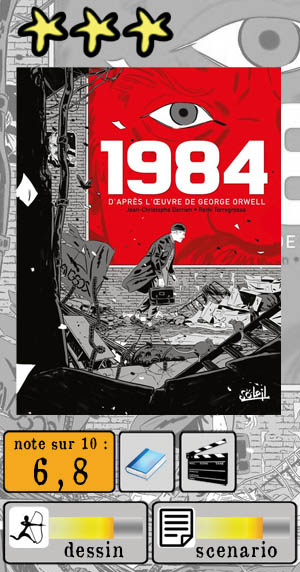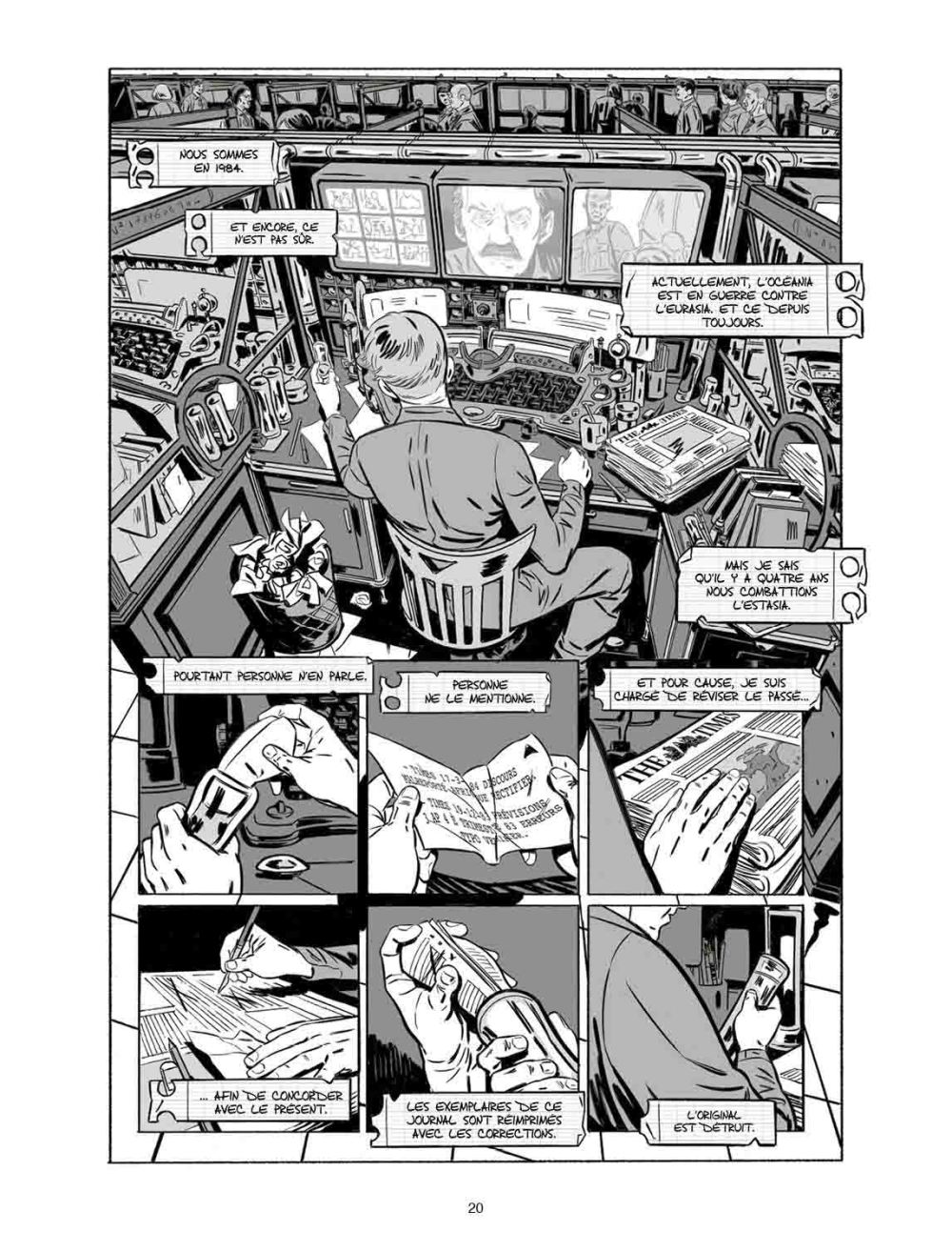 La narration de Jean-Christophe Derrien est de façon peu surprenante à l’image du dessin. Elle suit à la lettre la structure de l’œuvre littéraire, la seule digression que s’est autorisée le scénariste étant d’avoir choisi la narration subjective en utilisant les extraits de journal du héros Winston. Ce faisant, cette option permet à l’histoire de conserver une grande fluidité, à l’instar du roman d’Orwell.