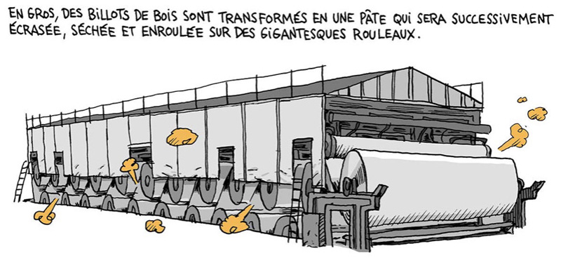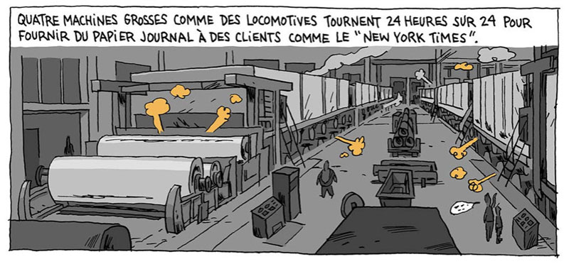 Guy Delisle se remémore le maniement de ces machines qui nécessitait une certaine dextérité et comportait des risques (en ce temps-là, la protection des ouvriers ne semblait pas être la préoccupation principale de la direction), et surtout cette étrange matière qu’était la pâte à papier, chaude et humide, d’une texture agréable, qu’il fallait retirer à la main lorsqu’elle s’accumulait dans les systèmes…