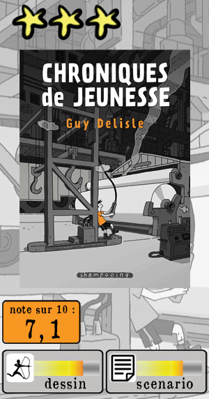 Guy Delisle évoque les souvenirs de son premier job d’été dans l’usine à papier où travaillait son père, à l’époque où il était étudiant en arts plastiques. Avec sobriété, il nous livre une description de son quotidien d’alors… ce travail était bien peu passionnant mais lui a fait découvrir un milieu où il ne se sentait pas vraiment à sa place. Il fallait par ailleurs une certaine dose de courage au jeune homme qu’il était pour quitter le confort de sa planche à dessin et rejoindre son équipe de nuit où il devait manier d’énormes machines, avec des horaires souvent aléatoires…