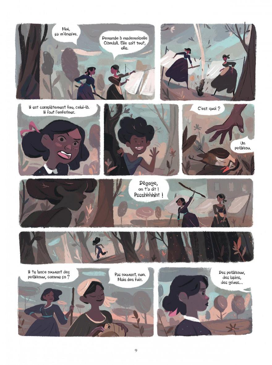 Lupano nous dispense une narration fluide, même s’il est vrai que l’histoire n’est pas très compliquée, et qu’en plus elle s’inspire de faits réels. On peut toutefois facilement imaginer que le scénariste d’Alim le tanneur et des Vieux Fourneaux a dû intégrer des éléments de fiction pour pimenter le récit, avec notamment deux personnages marquants, totalement inventés — contrairement à la directrice et ses pensionnaires —, qui représentent des points de vue radicalement opposés. Il y a d’abord ce jeune sauvageon noir, prénommé comme il se doit « Sauvage », provocateur un peu lettré prônant le retour à la nature et la révolte des esclaves, sorte petit lutin des forêts venu d’on ne sait où, qui se plaît à narguer les nouvelles pensionnaires « de couleur » dans leur velléité d’émancipation. Puis son antithèse, Miriam, une vieille dame recluse dans les bois et dissimulant sous son « masque » de sorcière les idées les plus avant-gardistes fortement empreintes de féminisme. Deux outlaws apportant la contradiction à ces jeunes filles noires désireuses de s’insérer dans la société blanche en accédant à l’instruction et à la connaissance, ne cherchant aucunement à remettre en question l’ordre établi. Deux rebelles « antisociaux » qui grattouillent là où ça chatouille et permettent parallèlement au récit de ne pas s’engluer dans une bouillabaisse de bons sentiments.
