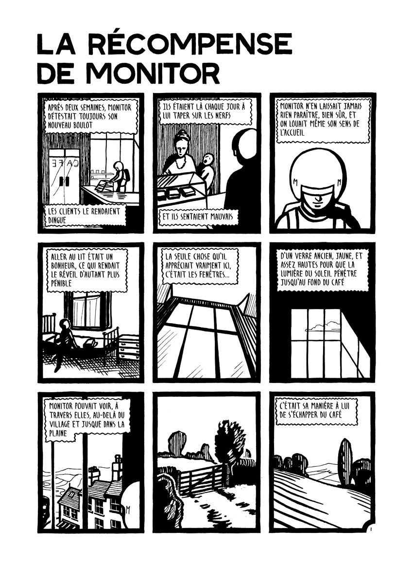 Le moins que l’on puisse dire, c’est que dès les premières pages, cet ouvrage produit d’emblée une certaine fascination. De plus, ces histoires courtes, qui se lisent rapidement, tiennent plus de la rêverie poétique que du pensum fastidieux. L’action — si l’on peut dire — se déroule dans une Angleterre provinciale qui ressemble à n’importe quel autre endroit sur Terre. L’univers intemporel de Reynolds s’inscrit dans un surréalisme imprégné de science-fiction des années 60, avec un héros récurrent et sans pouvoirs particuliers, Monitor, qui dissimule son visage sous un casque, tel un Daft Punk avant l’heure. On pourrait penser à La Quatrième Dimension si la narration était moins décousue, sans doute parce que selon son auteur, celle-ci passe au second plan. Les protagonistes semblent en effet aux prises avec des événements qui les dépassent, sans corrélation les uns avec les autres, et la linéarité apparente du récit s’entrechoque très souvent avec des déviations temporelles qui semblent dénuées de sens. Peut-être un miroir de notre monde que l’on voudrait cohérent mais qui parfois nous échappe dans sa marche aléatoire.