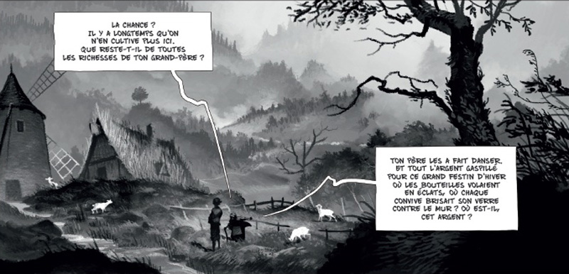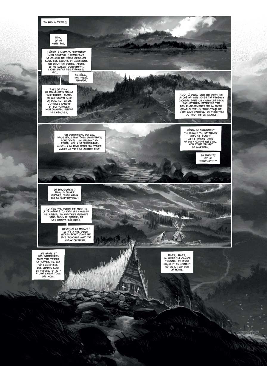 Quant à la narration, elle souffre d’un début un peu confus et fastidieux, et c’est peut-être le point faible de l’album. Il faudra attendre le tiers du livre pour se laisser embarquer dans les pas de ce jeune homme fougueux et arrogant qu’est Peer Gynt. Le texte d’origine, dont la poésie prend parfois le pas sur la lisibilité, n’y est peut-être étranger, mais ce début manque sans doute d’une accroche convaincante. Heureusement, le récit va monter en puissance dès lors que notre héros poète croisera sur sa route la jeune trolle dont il va tomber amoureux et qui l’emmènera dans son royaume… réel ou imaginaire, puisque nous l’avons dit, Peer Gynt a tendance à confondre ses rêves avec la réalité… Au fil des pages, on finira par s’attacher à ce personnage de doux dingue qui lui ne veut s’attacher à personne, d’une certaine façon admirable dans son délire mythomane et égoïste, malgré son incapacité à aimer en retour les femmes qui en tombent amoureuses. A la fin de ce premier volet, on perçoit que la dure réalité va commencer tout doucement à le rattraper avec la mort de sa mère, qui donnera lieu à la scène la plus touchante. Une fois encore, le jeune homme prendra la fuite, d’abord parce que les villageois haïssent cet être différent et provocateur dans sa quête de liberté et d’absolu, et qu’ensuite cela le conforte dans son désir irrépressible de découvrir le monde.