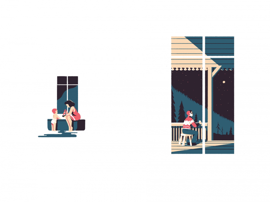 Tom Haugomat sait suggérer avec subtilité les sentiments malgré son dessin minimaliste, par le biais des poses et des attitudes, notamment lorsqu’il décrit la relation du personnage central — qui tend à délaisser sa vie privée au profit de sa carrière —, avec sa femme, relation qui commence à battre de l’aile, jusqu’à la séparation annoncée. Sur la page de gauche, on voit l’homme, assis à sa table de travail, tourner légèrement la tête sur le côté. Ce qu’il voit, c’est sa femme de dos dans la cuisine, les sacs de course à ses pieds, s’appuyant des deux bras sur le plan de travail. Cette seule image suffit à traduire la lassitude d’une épouse fatiguée de vivre aux côtés d’un homme qui toute sa vie sera passionné par le monde qui l’entoure, tout ayant oublié au fil des années de prêter attention à sa compagne de route. Un dessin qui exprime à lui seul le tragique d’un amour fané.