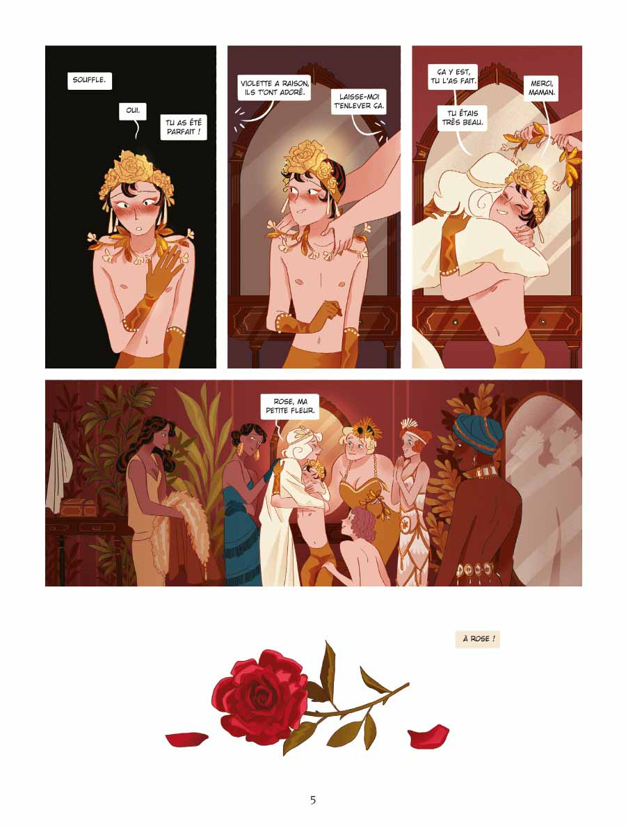 Quant à la narration, rien à redire là non plus, elle est impeccablement construite. Ces chroniques, bien qu’un tantinet fleur bleue, évitent pourtant tout pathos ou mélodrame inutiles. A cet égard, l’élégance du dessin est totalement en phase avec le scénario. Le lecteur va suivre avec fascination l’évolution de Rose, ce jeune homme, élevé « en vase clos » dans le cocon protecteur et entièrement féminin du cabaret dirigé par sa mère. Celui-ci va s’affirmer de plus en plus dans son identité transgenre, sous la houlette de celui qui deviendra son impresario, le charmant et distingué Monsieur Aimé.