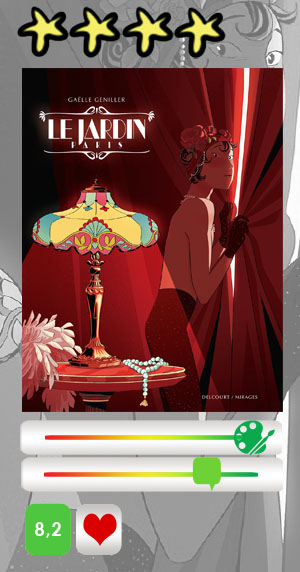 Cette fiction nous transporte – le terme est on ne peut plus adéquat — dans un cabaret parisien pendant les années folles. L’univers délicieux de Gaëlle Geniller est sublimé par les décors et accessoires de style Art nouveau, telle cette lampe de la couverture, et une palette de couleurs riches et chatoyantes. Le trait élégant, d’une sensibilité rare, retranscrit avec bonheur les mouvements gracieux des danseuses et danseurs, mais également les états d’âme des protagonistes. Ce cabaret, ce « jardin » paradisiaque, haut lieu des « nuits parisiennes enivrantes» de l’entre-deux-guerres où les danseuses portent des prénoms de fleur, on l’a à peine découvert qu’on ne voudrait déjà plus le quitter.
