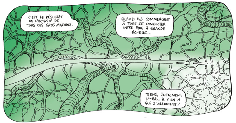 Une fois le livre refermé, le pauvre bipède que vous êtes risque bien de se prendre la tête dans les mains et se poser mille autres questions, voire être saisi de vertiges. Si la science n’a pas encore complètement décodé ce sacré cerveau, elle parvient de mieux en mieux à cerner les configurations de notre système neuronal et à le cartographier. D’ores et déjà, on a trouvé le moyen de commander des machines grâce aux signaux électriques émis par le cortex. En outre, certains apprentis sorciers de la Silicon Valley se prennent pour des démiurges en bossant sur l’intelligence artificielle, la transmigration de la conscience et toute cette sorte de choses. En somme mon bon monsieur, c’est l’avenir de l’humanité qui se dessine ici, ou si l’on préfère le transhumanisme … Bref, Mister Cerveau est une bande dessinée qui pourrait bien embraser vos neurones et activer certaines zones insoupçonnées dans les tréfonds de votre boîte crânienne. Le principal étant évidemment de ne pas s’y perdre, car il ne vous aura pas échappé que notre organe « le plus élevé » a toutes les caractéristiques du labyrinthe…