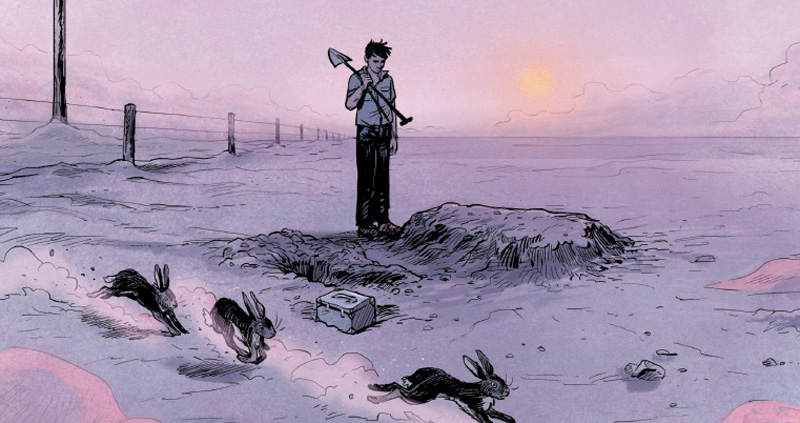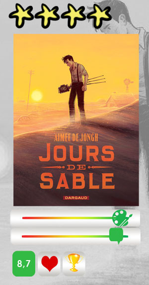 La narration impeccable, faite de longues plages de silence où le dessin prend le dessus, associée à une mise en page aux plans très serrés, souvent en pleine page, nous emporte telle une tornade au cœur de l’histoire. Et si la comparaison est facile, elle n’en est pas moins vraie… Le lecteur est littéralement immergé dans cette atmosphère suffocante aux tonalités oscillant entre le gris beige et le brun orangé. Visuellement, c’est aussi magnifique que la situation des habitants appauvris par la catastrophe n’est tragique, et l’esthétique soignée n’enlève rien à la puissance de l’image. Le cadrage est saisissant, comme si l’autrice avait cherché à nous mettre le nez dans ces vents de sable pour nous faire mieux ressentir l’âpreté d’une situation dont les victimes ont littéralement « mordu la poussière ». Le trait sensible et réaliste d’Aimée de Jongh retranscrit parfaitement les états d’âme de ces gens livrés à eux-mêmes, pris dans la nasse du désespoir et pour une bonne partie captifs d’une terre maudite, sans même avoir les moyens financiers de la quitter…