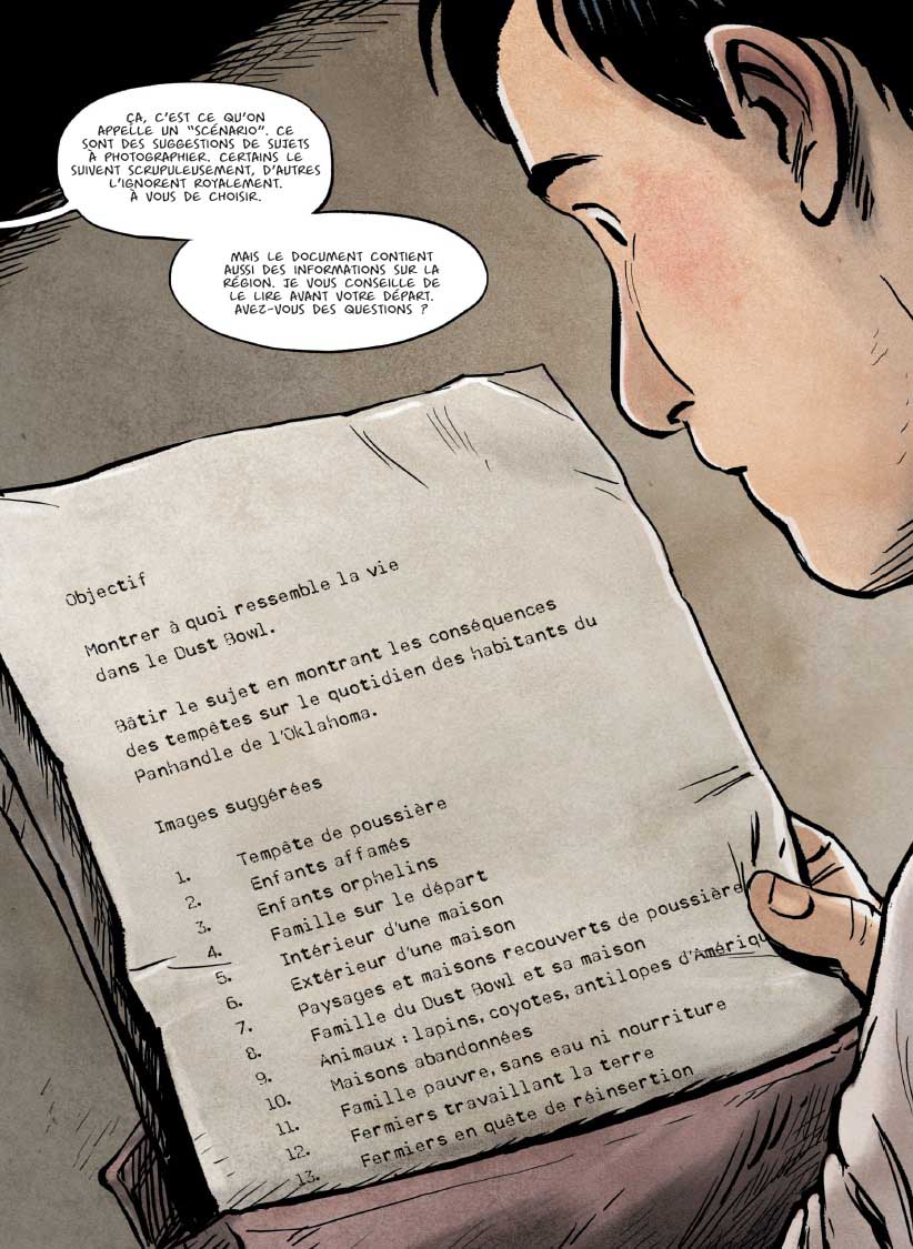 Le jeune héros, John, va vivre, à travers cette première expérience professionnelle en tant que photographe, un véritable parcours initiatique qui va le plonger dans des abîmes existentiels. Très vite, malgré sa jeunesse, le doute va l’envahir quant à l’éthique de la fonction qui lui a été assignée par le journal qui vient de l’embaucher : prendre des clichés suivant des thématiques très précises, un rien cyniques dans leur aspect factuel, car déjà à l’époque, le « choc des photos » était nécessaire pour augmenter les ventes. Mais il n’est pas pour autant question de porter un jugement trop sévère sur ces photographies, dont la mise en scène pouvait travestir la réalité pour la rendre plus percutante. Car sans ces témoignages sur pellicule (et ces portraits saisissants, dont certains ont marqué la conscience collective, en particulier celui de cette mère migrante par Dorothea Lange), qu’aurions-nous su de cette tragédie et quelles traces en aurait gardé l’Histoire ? Aimée de Jongh elle-même aurait-elle pu réaliser cet album ? Pourtant, John, ce garçon sensible et empathique, l’est peut-être un peu trop pour exercer un métier se résumant à observer le monde dans sa dureté, où le photographe croit se protéger derrière la froideur mécanique de son objectif…