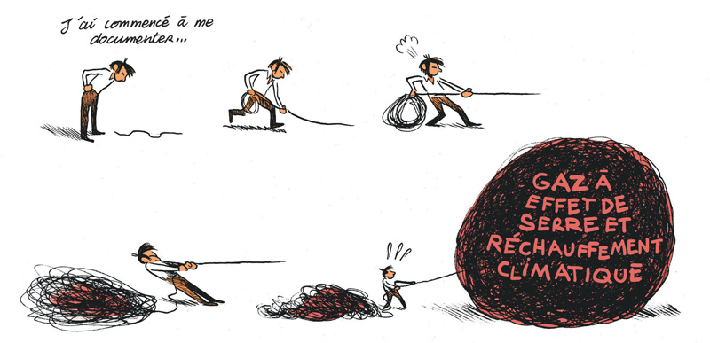 En résumé, Le Monde sans fin est une vraie réussite à mettre entre toutes les mains, parce que l’ouvrage réunit de nombreux critères pour une lisibilité parfaite, grâce à sa rigueur narrative et la clarté du propos de « Janco », alliée au dessin plein d’humour de Blain, le tout générant une qualité ludique pour un sujet qui ne l’est pas vraiment à la base. Et l’air de rien, ce livre remet du baume au cœur dans notre contexte particulièrement anxiogène en nous offrant une analyse rationnelle, loin des fantasmes apocalyptiques mis en avant par certains. Il bouscule également nos certitudes et risquerait bien de faire évoluer notre point de vue (c’est mon cas en ce qui me concerne). Ce qui constitue un élément marquant de cet essai, c’est l’approche développée par Jancovici sur le nucléaire, qui prouve de façon très factuelle que cette énergie est aujourd’hui la plus propre, loin d’être aussi dangereuse que l’on veut bien le croire. Notre polytechnicien ne s’est pas fait que des amis chez les écolos avec cette affirmation mais pour lui il est urgent de dédramatiser : « Le nucléaire est un peu comme l’avion de ligne. Les accidents frappent les esprits et créent un sentiment d’effroi. » De plus, les énergies renouvelables (hydraulique, éolien, solaire) ne suffiront jamais à compenser l’abandon du charbon et du pétrole, qui aujourd’hui représentent une part largement majoritaire des sources d’énergie. On apprendra en conclusion que notre course folle vers le progrès est directement liée à un bout de notre cerveau, le striatum, qui nous pousse à vouloir toujours plus… En avoir conscience, c’est sans doute une bonne manière d’entamer une thérapie de désintoxication… Reste à savoir si les « décideurs » gravement accros à un système largement corrompu par la doxa capitaliste se sentiront concernés par ces propositions visant seulement à ne pas scier la branche sur laquelle on est assis ! Le temps presse…