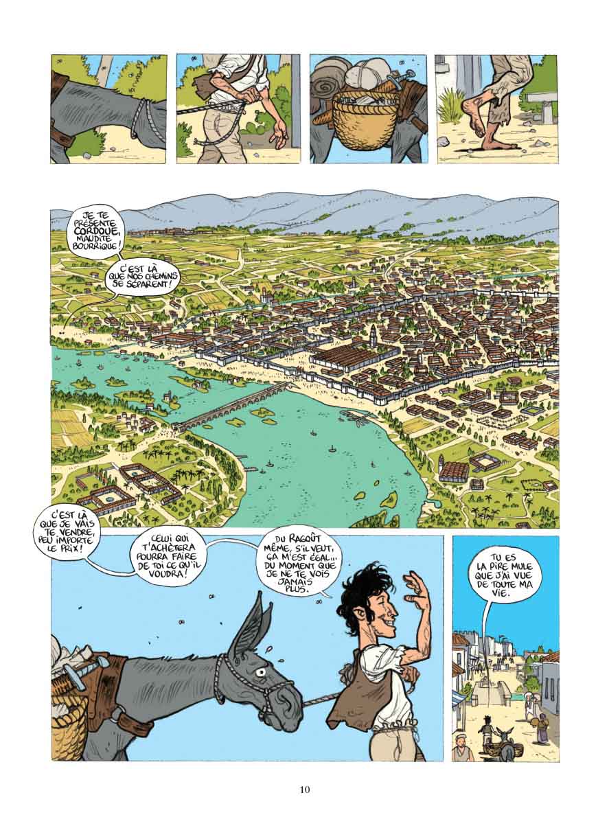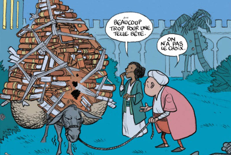 Nous allons donc suivre la fuite rocambolesque de ces trois personnages, Tarid l’eunuque bibliothécaire, Lubna, l’esclave copiste et Marwan, l’ancien élève de Tarid reconverti en voleur. Leur but : sauver le maximum de livres qu’ils chargeront sur une pauvre vieille mule, alors que les nouveaux maîtres du califat ont décidé de brûler la quasi-totalité des ouvrages de la bibliothèque de Cordoue. Avec travers cette fiction que l’on pourrait qualifier d’épopée donquichottesque, Lupano fait revivre une période de l’Histoire européenne passionnante, assez méconnue, quoi qu’on en dise, par le pékin lambda (Oui, Al-Andalus englobait aussi certaines régions du Sud de la France, notamment la baie de Saint-Tropez ! Oui l’Islam aussi a été « occidental » et a contribué au rayonnement des sciences et de la philosophie en terre d’Europe !). Renforcée par un remarquable souci de la vérité historique, la narration est enlevée comme Wilfrid Lupano sait le faire, en mettant en scène des personnages déclassés, héros modestes et attachants capables de réaliser de grandes choses avec leurs petits moyens.