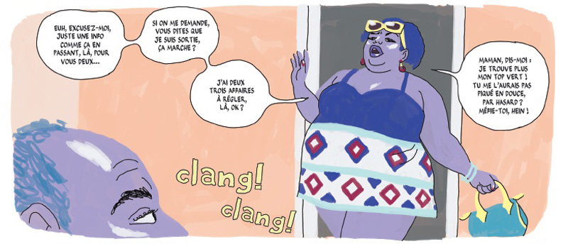 L’auteur a posé sur cette misère sociale des couleurs bariolées, et criardes qui plus est, car dans Ecoute Jolie Márcia, on n’est pas dans la nuance. Ça gueule tout le temps, ça brasse dans tous les sens, ça hurle, ça pète les plombs, ça rie et ça crie fort, et parfois ça castagne sévère. On n’est pas dans un décor de rêve, pas davantage dans un manoir victorien feutré qui pourrait rassurer le bourgeois. D’ailleurs ça pique un peu les yeux, et même le dessin est mal fagoté… La seule concession de l’auteur aux clichés sur son pays, ça sera donc cette fameuse couleur, qui est là pour mettre un peu de baume sur la misère, car au Brésil, « grisaille » semble être décidément un mot inconnu du dictionnaire.