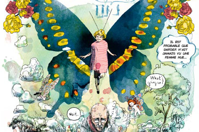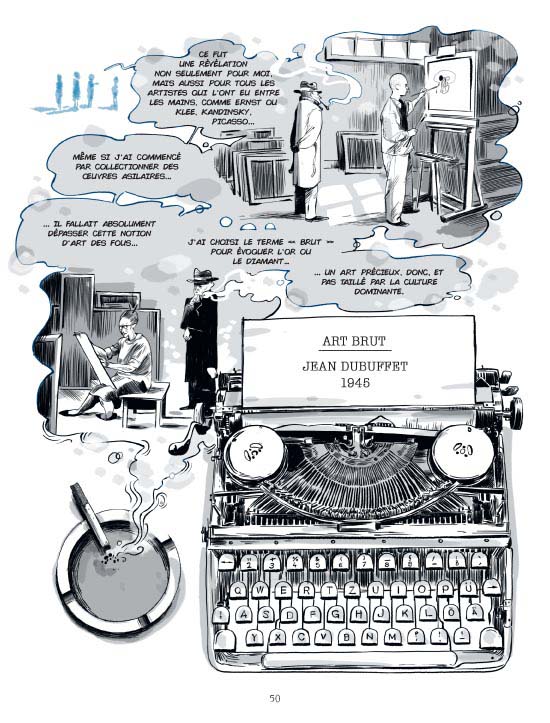 Bref, d’un point de vue graphique, l’ensemble est assez inégal, s’articulant autour de trois axes : un crayonné bleuté, un peu sec à mon goût, pour les dialogues entre la jeune étudiante aux Beaux-arts et les 3 fantômes de Hans Prinzhorn, Jean Dubuffet et Harald Szeeman, un encrage noir et blanc pour les biographies d’artistes et la couleur pour évoquer leur art.
