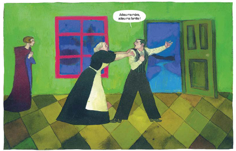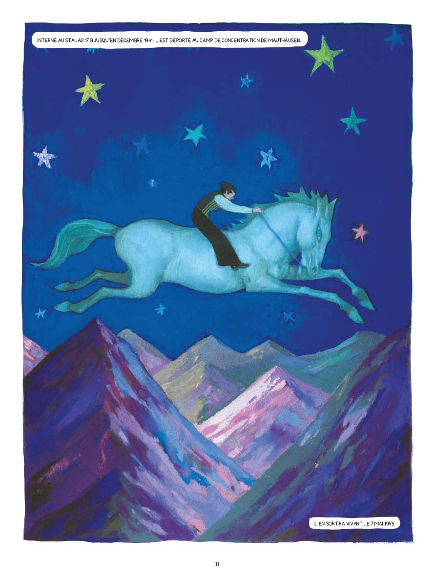 D’un point de vue graphique, la trame principale, qui a trait à l’enfance de l’auteur jusqu’à l’âge adulte, est donc traitée dans un style semi réaliste très pictural. David Sala restitue de façon étonnante l’atmosphère des années 70, tant dans l’aspect vestimentaire que du mobilier. Les nappes à fleurs « moches » prennent soudain une autre dimension, tout comme les « affreux » papiers peints désuets. Les motifs « vintage cheap » qui prêtent parfois à la moquerie aujourd’hui deviennent sous le pinceau de l’artiste de véritables œuvres d’art que l’on admire longuement. Aux côtés de la narration centrale viennent se greffer les récits d’Antonio et de Josep, dans un mode plus onirique (la scène inaugurale relatant la fuite d’Antonio vers la France est juste sublime) avec une tournure plus expressionniste lorsqu’il s’agit de décrire le quotidien dans les camps nazis, où les couleurs franches comme l’enfance semblent tenir à distance l’horreur et l’immonde. Il serait presque embarrassant de dire que visuellement c’est magnifique, mais ce contraste renvoie à l’imagination du garçonnet qu’était alors David, tout en obligeant le lecteur à affronter l’ineffable noirceur de l’âme humaine que les mots ne sauraient décrire.