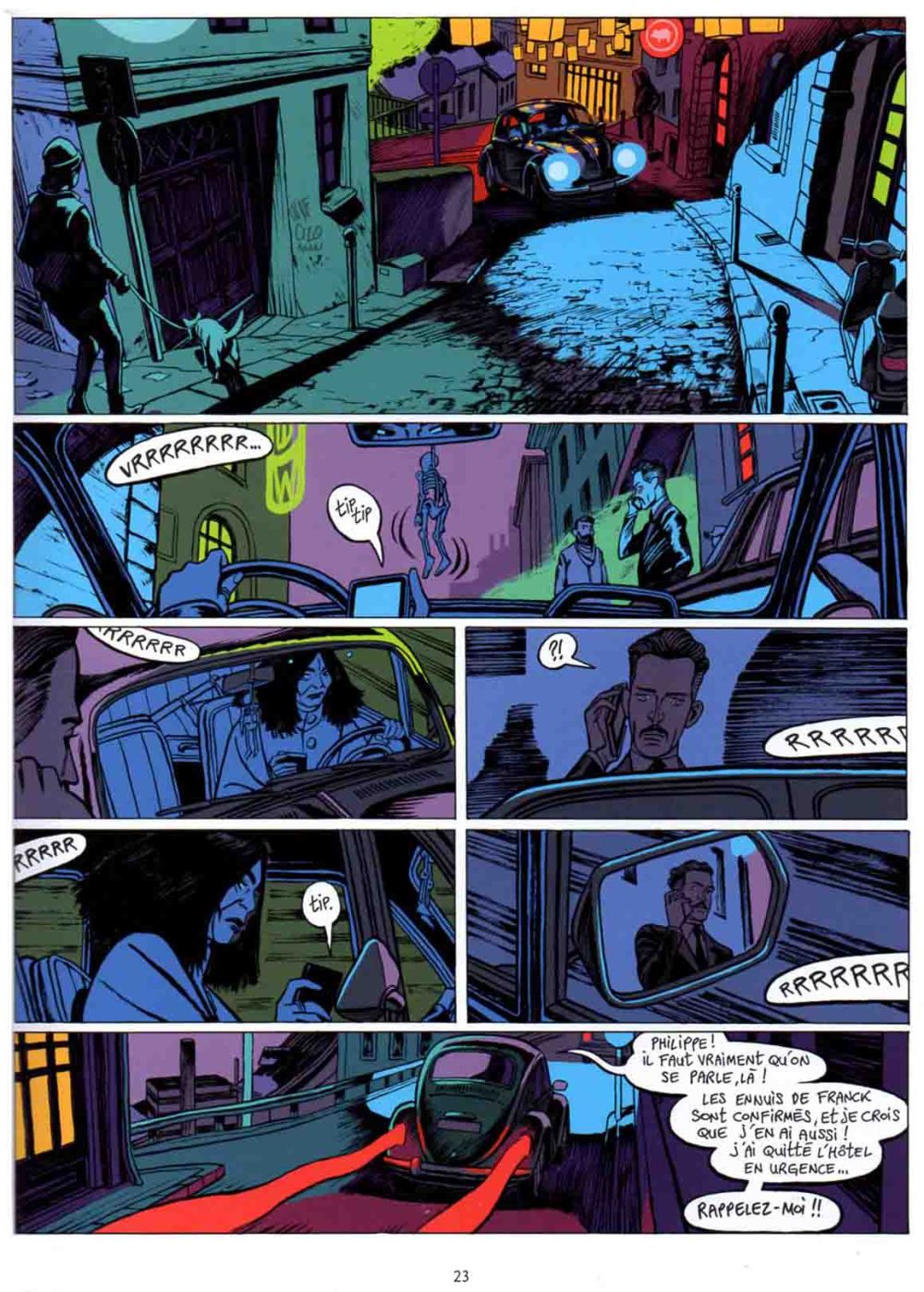 Peeters poursuit dans son parti pris radical dans la colorisation — en particulier dans les scènes d’intérieur ou urbaines —, qui, même si l’effet de surprise est déjà passé, emporte l’adhésion. La scène de l’interrogatoire de Sangaré reste la plus édifiante, tout en fureur et en douleur, avec une lutte crispée entre le bleu et le rouge qui culmine dans un jaune explosif. De même, on est séduit par le cadrage très cinématographique et l’ambiance à la Twin Peaks de ce récit choral, en particulier lors des dernières pages où s’égrènent des plans fixes sur les personnages de l’épisode, exposant au lecteur leur solitude et leur douleur, conscientes ou non, dans un silence nocturne et tragique.