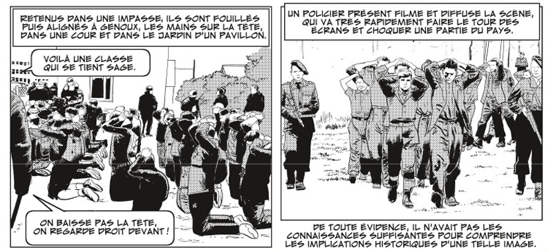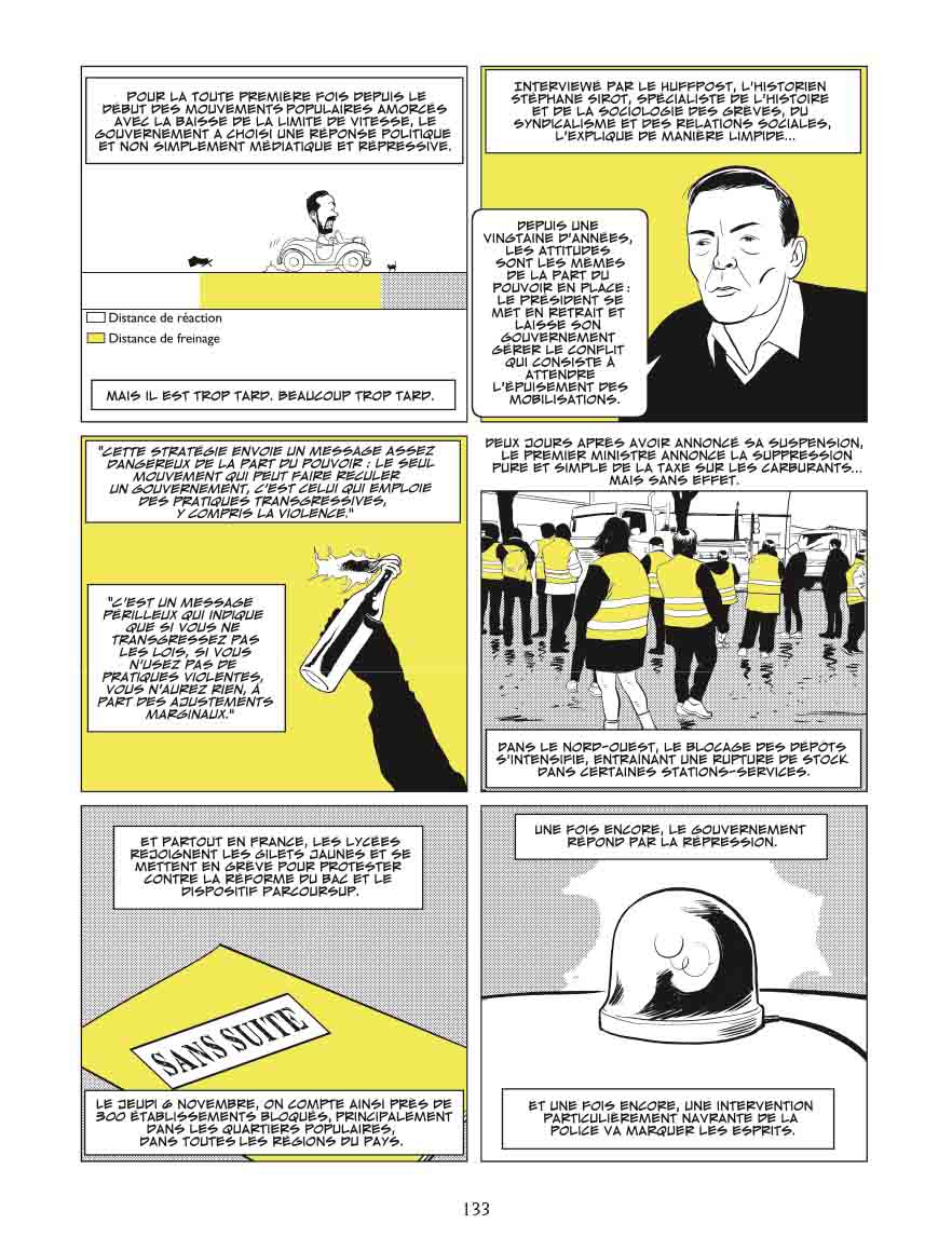 Si la taille de l’objet et sa densité peut effrayer au premier abord, le talent du scénariste qu’est David Chauvel rend la lecture parfaitement lisible. La bonne idée est d’avoir découpé le livre en 13 actes, clin d’œil judicieux au mouvement qui nommait ainsi les dates de manifestations, chaque introduction faisant apparaître moult citations d’Emmanuel Macron, parfois édifiantes et non dénuées de contradictions. La ligne claire réaliste et sobre de Kerfriden, qui s’appuie sur des photos ou des vidéos d’actualité, fait le reste, totalement adapté au propos. Bénéficiant d’une mise en page assez variée, ce docu-BD, en noir et blanc… et jaune (logique, non ?), nous fait revivre les événements de façon très détaillée. Tout y est, absolument tout, et l’on revoit parfois avec effroi ces images d’une violence terrible — car si la violence était le fait d’une petite partie des Gilets jaunes, celle des forces de police se déchaînait bien souvent contre des manifestants pacifistes qui ne faisaient qu’exprimer leur désir d’une vie meilleure et leur opposition au projet néolibéral et antisocial de Macron —, des images désormais rentrées dans l’inconscient collectif français à force de passer en boucle sur les chaînes TV ou les réseaux sociaux. La seule chose qui change est la perspective, très différente de celle adoptée à l’époque par les grands médias, surtout nationaux, qui ont la plupart du temps manqué d’objectivité, aveuglés par un déni stupéfiant.