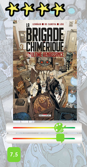 Tout cela fait de La Brigade chimérique – Ultime Renaissance, pourrait-on dire, un vrai comics européen. Le format très vertical propre au genre est respecté, avec un découpage en huit épisodes qui auraient dû paraître les uns après les autres, mais Covid oblige, le projet est tombé à l’eau, comme l’explique Serge Lehman dans la passionnante post-face qui ne fait que dévoiler sa connaissance exhaustive du sujet. Le récit a finalement été publié en intégrale, et la motivation de David Chauvel, directeur éditorial quand il n’est pas scénariste, n’y est pas étrangère (on lui sera infiniment reconnaissant d’avoir cru au projet), car l’accouchement a été compliqué pour ce « bébé mal né ».
