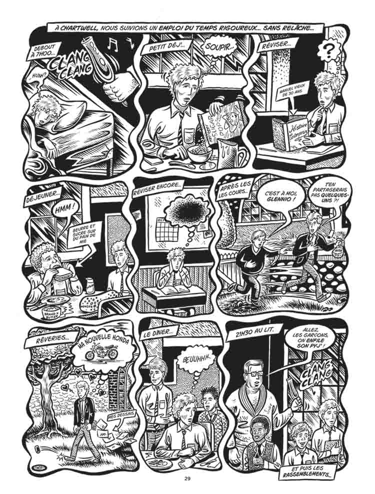 Avec ce récit autobiographique dont la couverture évoque davantage un conte gothique horrifique, Glenn Head relate son adolescence passée dans ce pensionnat lugubre du New Jersey mais à la réputation prestigieuse, « à la manière britannique », Le Manoir de Chartwell. Cet établissement avait pour objectif de repêcher les élèves en difficulté. Alors que Glenn était peu doué pour les études, ses parents avaient décidé de l’y envoyer afin de faire de lui un élève modèle. Mais le vernis va très vite se fissurer, car il y a décidément quelque chose qui ne tourne pas rond chez Lynch, le directeur de l’établissement, qui a pour lubie de se faire appeler « Monsieur ». Car « Monsieur » aime les jeunes garçons, au-delà du raisonnable. Mégalo et adepte des châtiments corporels, de l’humiliation publique et de la manipulation mentale, cet odieux personnage souffle le chaud et le froid. Quand sa main ne manie pas le bâton, elle se fait baladeuse et – un peu trop – caressante avec ses jeunes pensionnaires, qui pour la plupart en manque d’affection, s’accommodent de ces pratiques libidineuses ou préfèrent en rigoler pour mieux masquer, sans doute, leur malaise.