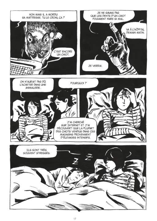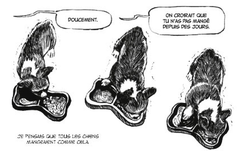 A coup sûr, Keum Suk Gendry-Kim les a beaucoup observés, les toutous, et dans toutes les postures possibles et imaginables ! Il y a d’abord Carotte, le chiot adopté par le jeune couple, puis Patate, encore plus petit par la taille, déposé anonymement dans un carton au pied de leur porte, alors que Hoon et Yuna viennent tout juste d’emménager à la campagne. On fera également connaissance avec les chiens du voisinage, les Chouquettes (1, 2 et 3), Elvis, et puis enfin Choco, enfermé pendant des mois dans une cage par des propriétaires qui se désintéressaient totalement de son sort. Bouleversé par le regard d’une tristesse insondable du pauvre canidé, le couple se résignera à l’accueillir dans sa demeure.