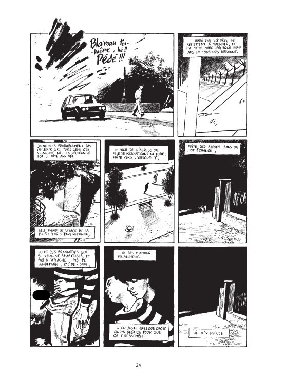 Si vous appréciez les histoires simples, je vais vous faire gagner du temps : vous pouvez passer votre chemin ! Ce journal est une œuvre exigeante qui atteint un niveau d’introspection rarement vu dans une autobiographie. Fabrice Neaud, à l’époque âgé de 24 ans, y évoque ses débuts artistiques difficiles, au début des années 90, dans sa ville de province (dont il ne citera jamais le nom) : travaux de commande peu gratifiants, engueulades récurrentes avec son associé Alain, galère de thunes… l’auteur y parle aussi d’une vie amoureuse peu satisfaisante, de ses sorties vaines dans le bar homo de la ville, de ses rencontres nocturnes furtives dans le parc voisin, des jeux de drague qui se terminent parfois mal, les « casseurs de pédés » ayant toujours su où aller pour assouvir leur pulsions haineuses et masquer leur frustration sexuelle…