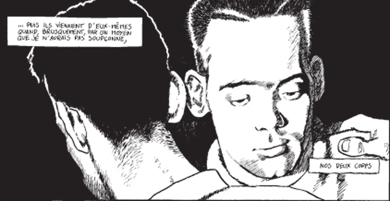 En outre, Fabrice Neaud dessine le désir homosexuel avec brio, magnifiant les portraits tirés de ses clichés photographiques, saisissant parfaitement les sentiments derrière les regards et les sourires. Son trait noir et blanc, à la base réaliste mais davantage centré sur les personnages que sur les décors, rend les émotions vibrantes en recourant à une technique quasi impressionniste : visage floutés, hachurés, rayés ou littéralement effacés. Son sens accompli du découpage fait le reste, Neaud établissant un dialogue permanent, toujours plein d’a-propos, entre dessin et texte.