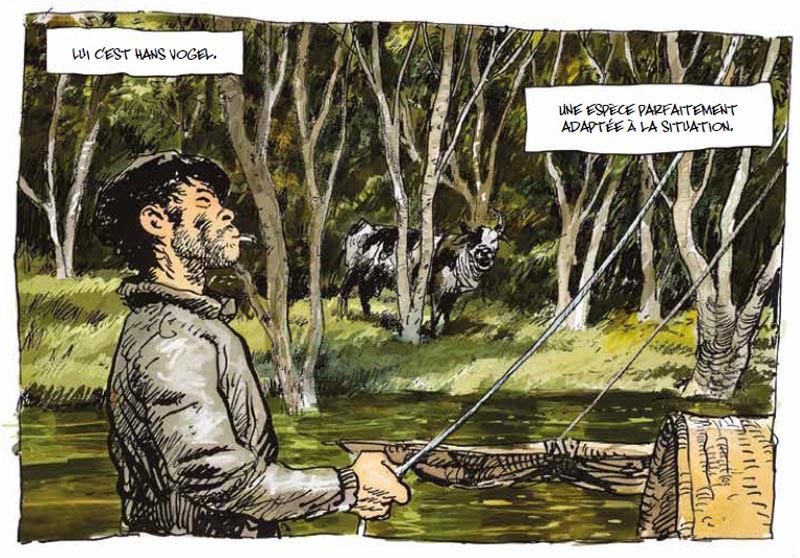 On suit donc cette famille quelque peu éparpillée, Hans le baroudeur divorcé aux faux airs de Blueberry qui se remet mal d’une peine de cœur, sa mère Jeannes, qui erre de cabane en cabane le long du « fleuve » pour échapper aux hélicoptères du gouvernement, sa fille Vinee, étudiante et punkette en révolte qui rejette le « nouveau » monde qu’on lui propose, et enfin, le grand frère de Hans, Gorza, géant bourrin et simplet mais d’une gentillesse touchante que rien ne semble corrompre, peut-être le personnage le plus attachant du récit. Dans la description de ce monde violent, à peine plus que celui que nous connaissons car il n’en est que le prolongement imaginaire, vient s’ajouter une réflexion politique sur son devenir. Comme le constatent avec dépit Vinee et sa nouvelle amie Safia, la crue n’a rien changé, elle n’a même pas réveillé les esprits… C’est l’inverse qui se produit, et « la peur, c’est toujours elle qui parle en premier… Quand la nature envoie un signal, l’Homme ne comprend jamais le message. » Des propos qui font étrangement écho à ce que nous vivons actuellement… Cela étant, Flao nous offre une note d’espoir en montrant cette communauté — qui rappelle quelque peu les mouvements zadistes voire les Gilets jaunes —, redécouvrant les bienfaits de la solidarité et de l’entraide dans ce contexte « post-apo », où les autorités n’ont pas abandonné leur volonté de contrôle de la population.